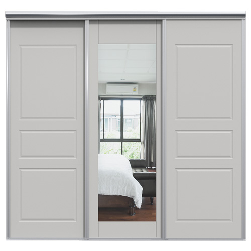Skjutdörrarna är av 8 mm målad och spårfräst MDF och spegeln är av 4 mm spegelglas med en säkerhetsfilm på baksidan. Grepplist, tak- och golvskena i aluminium.