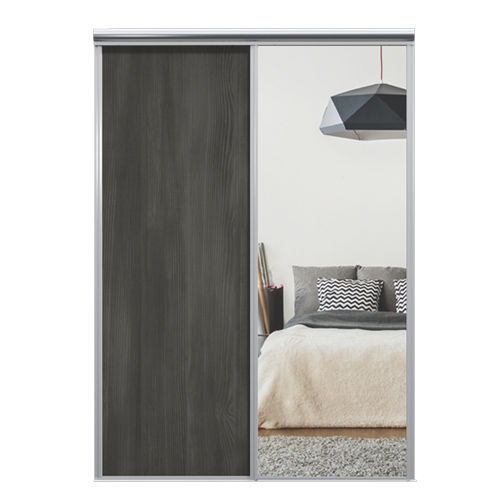 Skjutdörr med en mörk träimitation och spegel som ger liv till ditt hem.