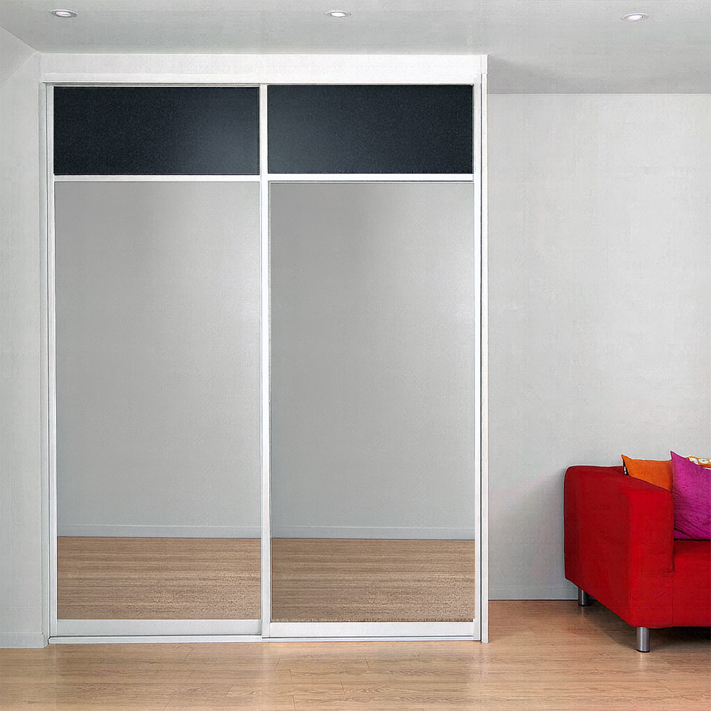 Spegelskjutdörren är av 4 mm spegelglas med en säkerhetsfilm på baksidan och toppskivorna är av 10 mm melaminbelagd MDF. Grepplist, tak- och golvskena är i aluminium.