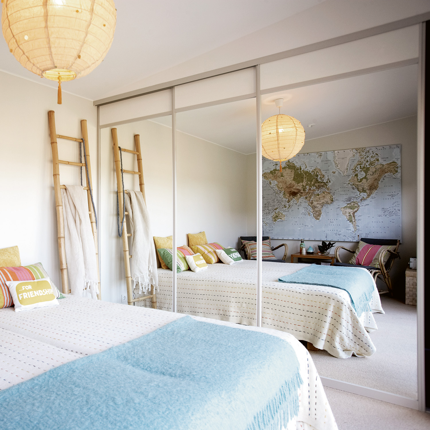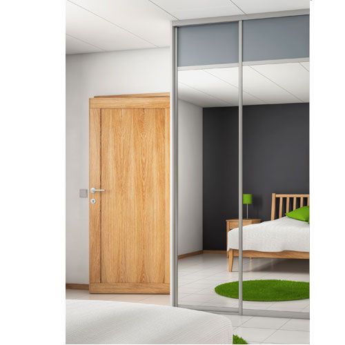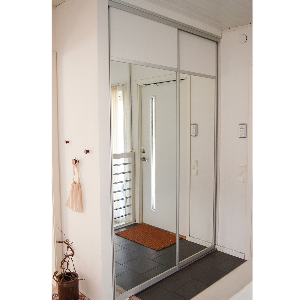 Skjutdörr Spegel är av 4 mm spegelglas med en säkerhetsfilm på baksidan. Toppskivorna är av 10 mm melaminbelagd MDF. Grepplist, tak- och golvskena i aluminium.