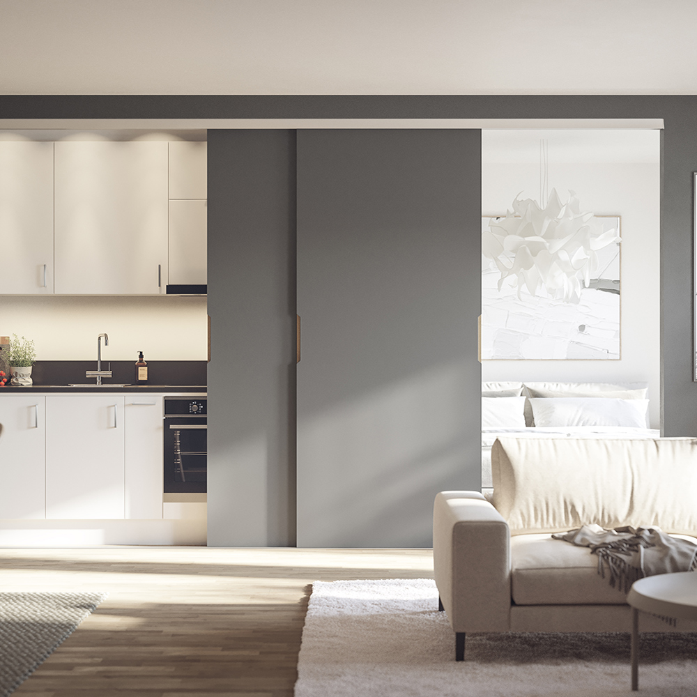 Vår skjutdörrslösning är även perfekt att använda för att dela av utrymmen i ditt hem. Du kan skapa extra rum med denna smarta rumsavdelare genom att sätta upp den i vardagsrummet, sovrummet eller annat ställe där det passar för dig.