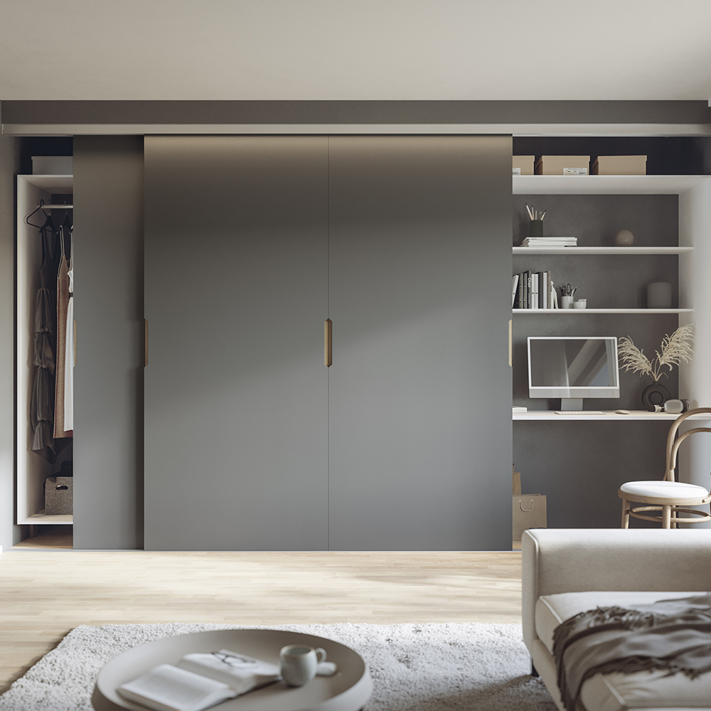 Med hjälp av dessa skjutdörrar kan du skapa en unik och praktisk förvaring som är anpassad utifrån dina behov. Till skillnad från en vanlig garderob får du här ett luftigare utrymme och du kan justera både djupet och garderobsinredningen helt själv.