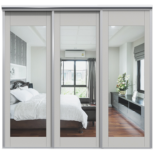 Skjutdörrarna är av 8 mm målad och spårfräst MDF och sspegeln är av 4 mm spegelglas med en säkerhetsfilm på baksidan. Grepplist, tak- och golvskena i aluminium.