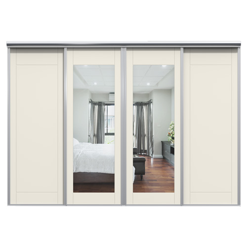 Skjutdörrarna är av 8 mm målad och spårfräst MDF och spegeln är av 4 mm spegelglas med en säkerhetsfilm på baksidan. Grepplist, tak- och golvskena i aluminium.
