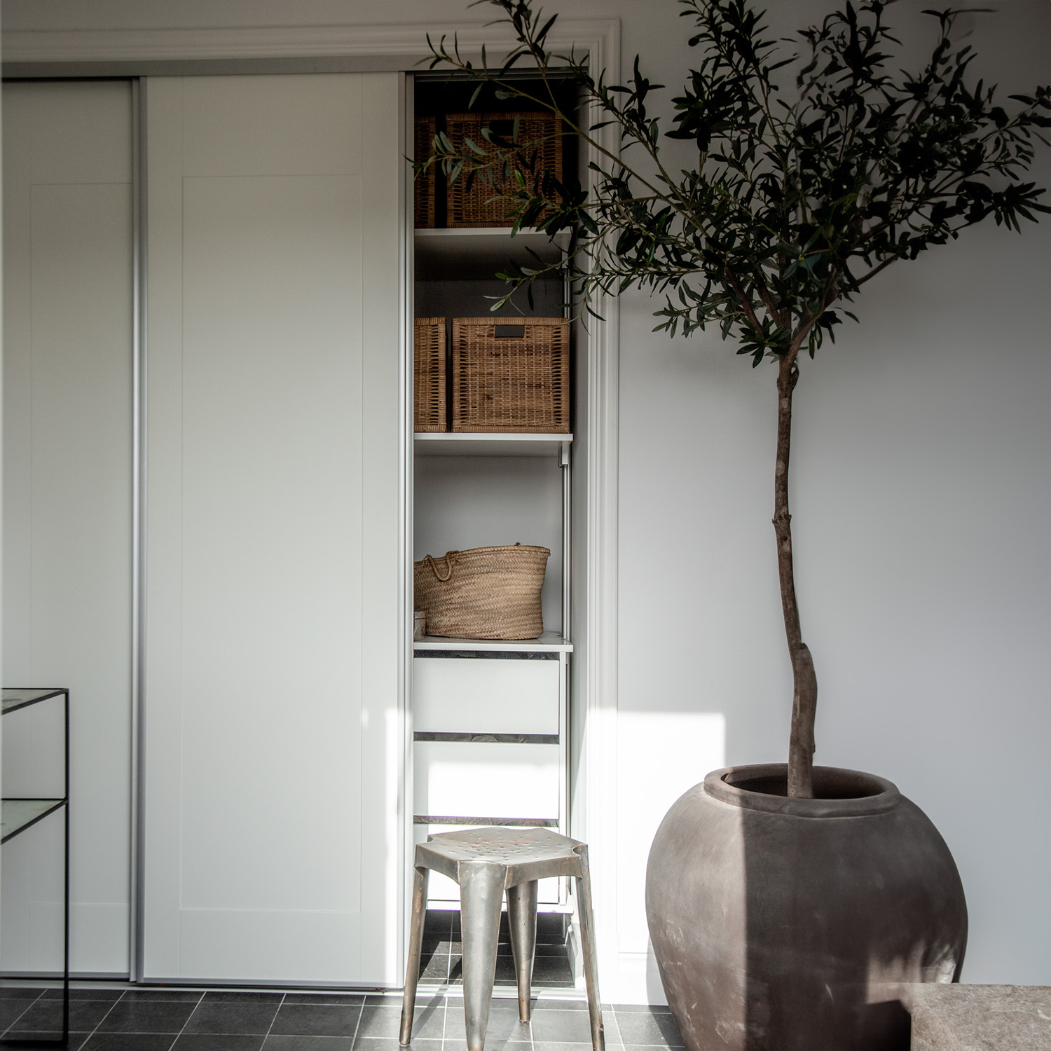Skjutdörrarna är av 8 mm målad och spårfräst MDF. Grepplist, tak- och golvskena i aluminium.