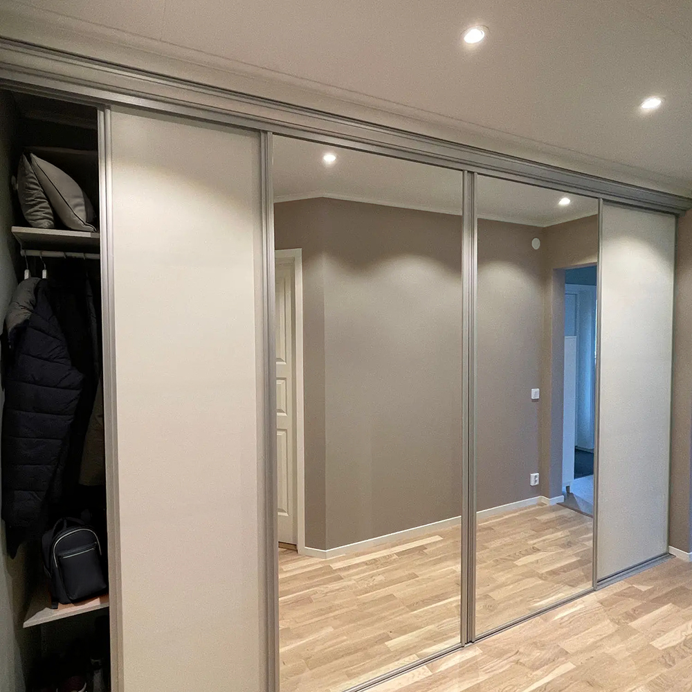 Skjutdörrarna är av 8 mm melaminbelagd MDF. Silverspegeln är av 4 mm spegelglas med en säkerhetsfilm på baksidan. Grepplist, tak- och golvskena i aluminium.