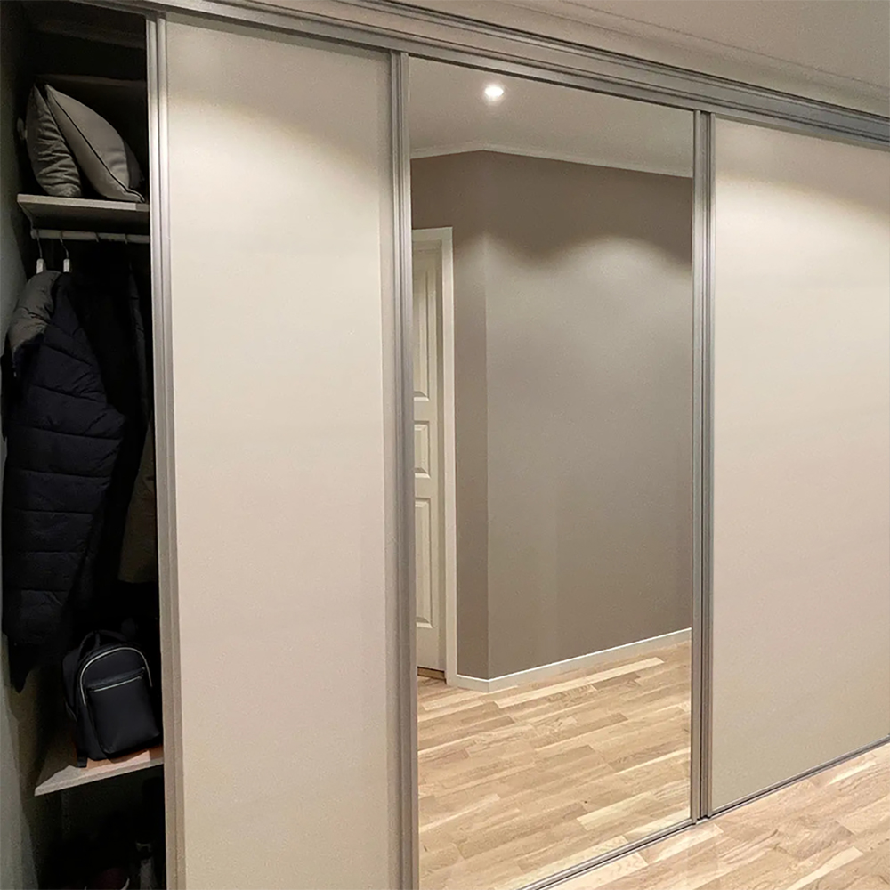 Skjutdörrarna är av 8 mm melaminbelagd MDF och spegeln är av 4 mm spegelglas med en säkerhetsfilm på baksidan. Grepplist, tak- och golvskena i aluminium.