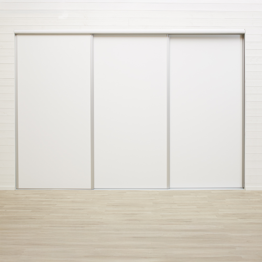 Skjutdörrarna är av 8 mm melaminbelagd MDF. Grepplist, tak- och golvskena i aluminium.