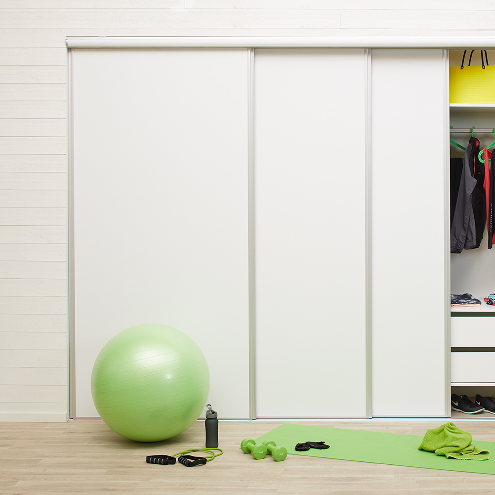 Skjutdörrarna är av 10 mm melaminbelagd MDF. Grepplist, tak- och golvskena i aluminium.