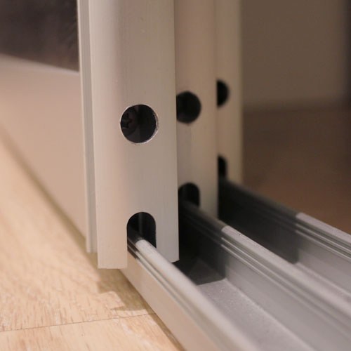 Skjutdörrarna är av 10 mm melaminbelagd MDF. Grepplist, tak- och golvskena i aluminium.