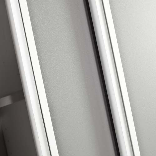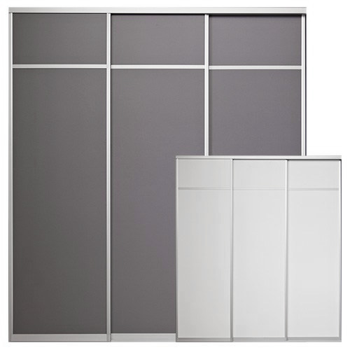Skjutdörrarna är av 10 mm melaminbelagd MDF. Grepplist, tak- och golvskena i aluminium.