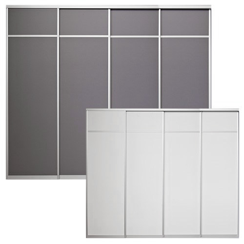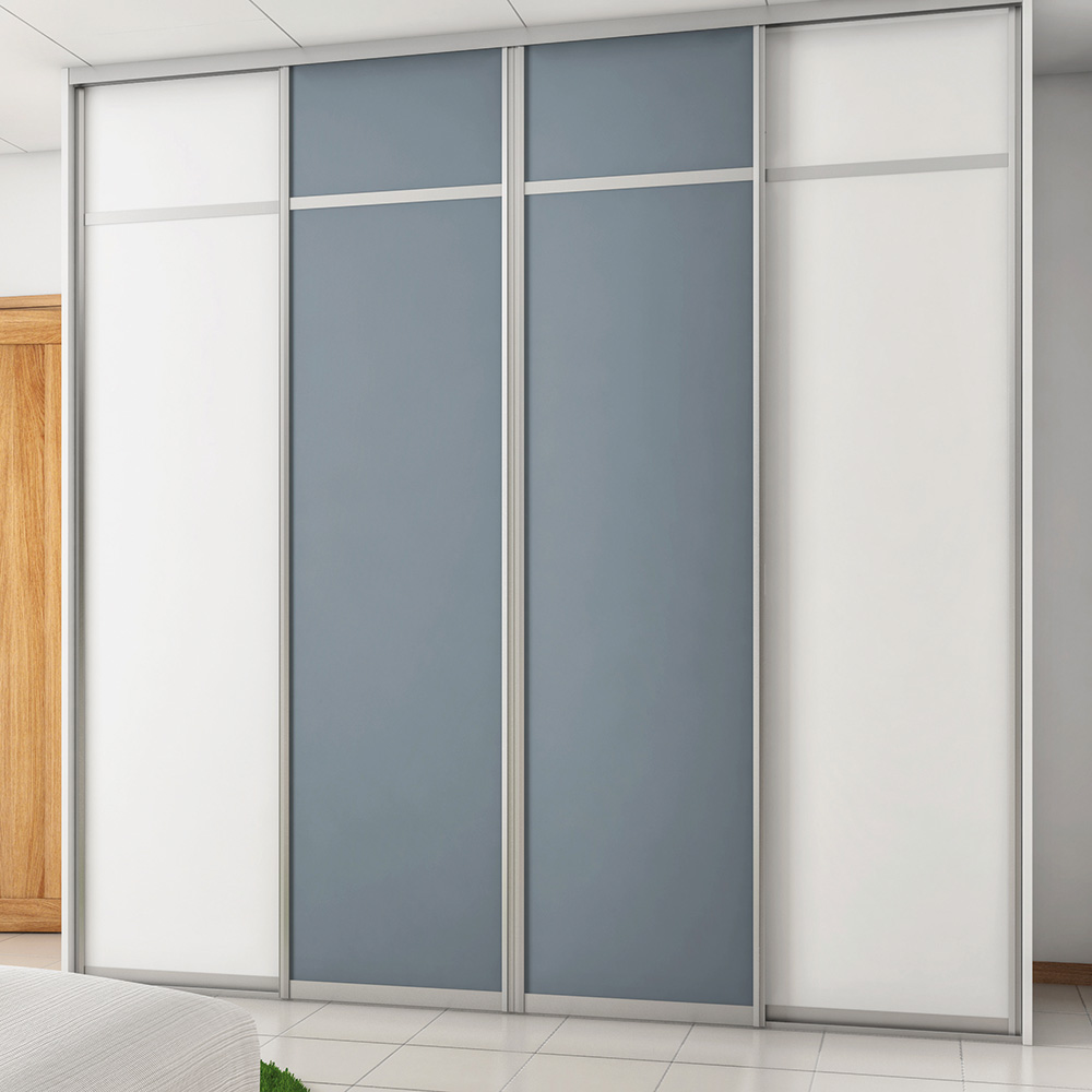 Skjutdörrarna är av 10 mm melaminbelagd MDF. Grepplist, tak- och golvskena i aluminium.