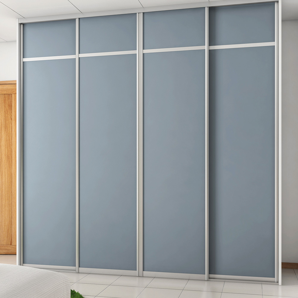 Skjutdörrarna är av 10 mm melaminbelagd MDF. Grepplist, tak- och golvskena i aluminium.
