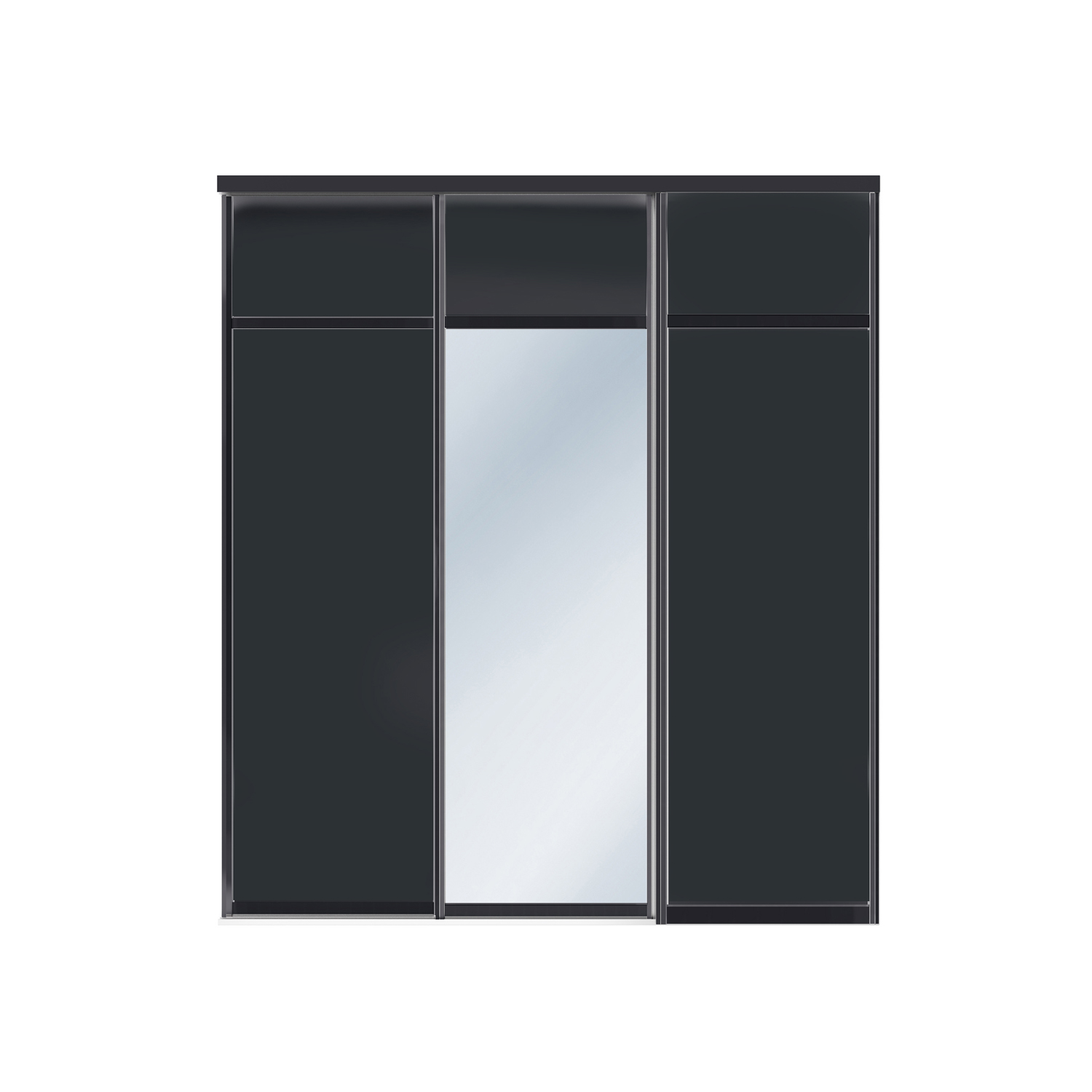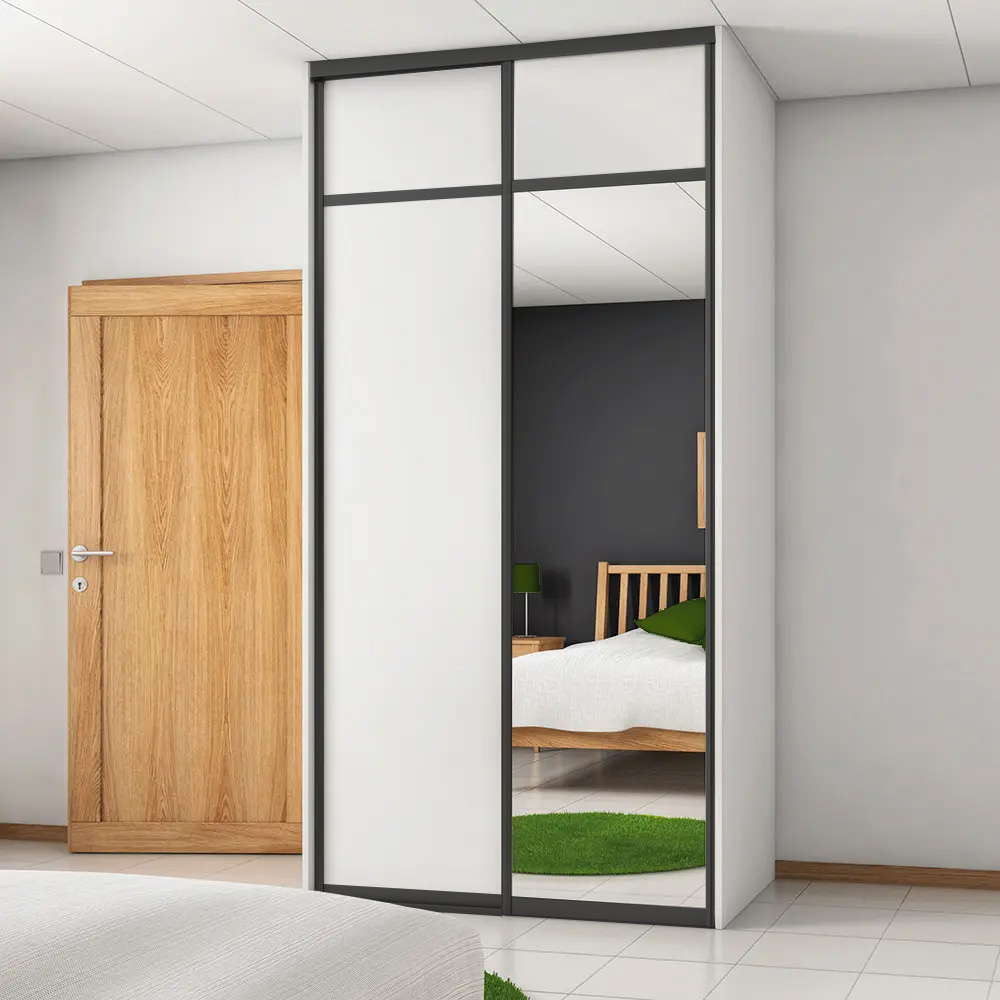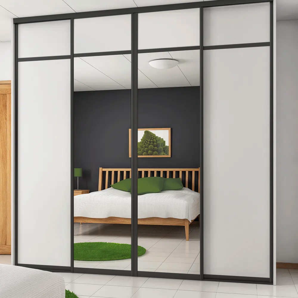 Spegelskjutdörren är av 4 mm spegelglas med en säkerhetsfilm på baksidan. De svart/vita skjutdörrarna är tillverkade av 10 mm melaminbelagd MDF och de har grepplist, tak- och golvskena i aluminium.