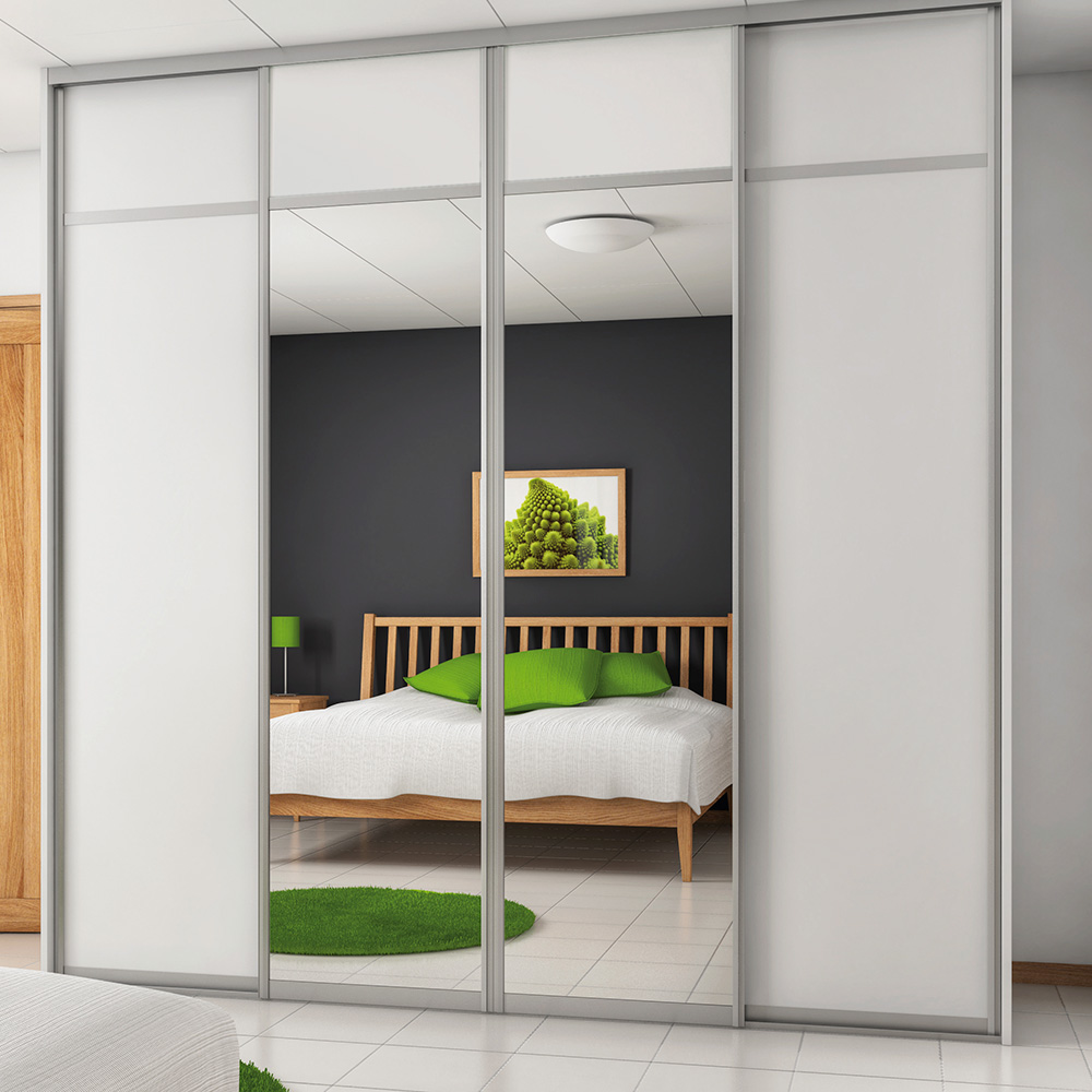 Skjutdörren Vit/Grå är av 10 mm melaminbelagd MDF. Spegelskjutdörren är av 4 mm spegelglas med en säkerhetsfilm på baksidan. Grepplist, tak- och golvskena i aluminium.