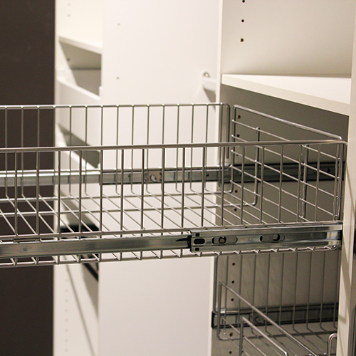 Trådback för en luftig förvaring med utdragsskenor som drar ut lådan fullt ut, utanför stommen.
