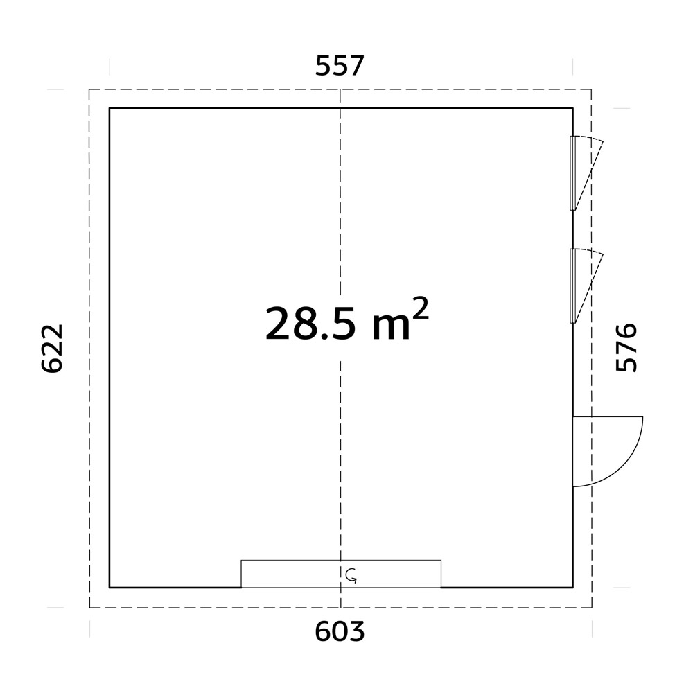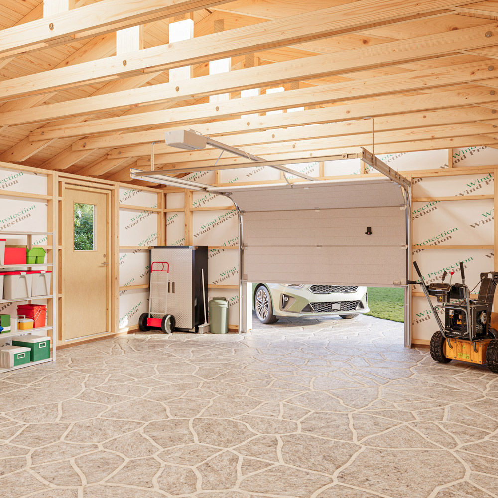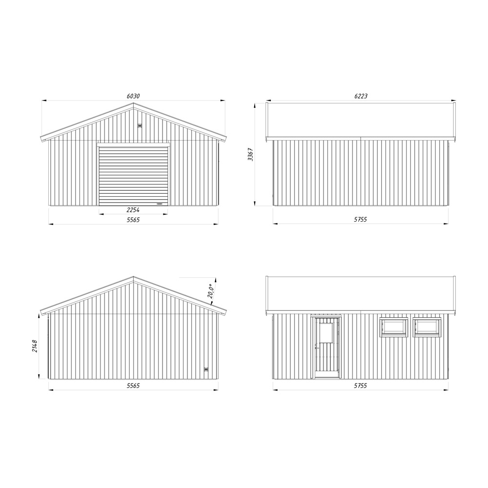 Garage med takskjutport och sidodörr. Färdiga väggelement som invändigt är klädda med vindskyddsfolie, vilket gör detta garage extremt väderbeständig, speciellt mot regn och vind. Väggar, golv och tak kan även isoleras, med upp till 95 mm isolering.