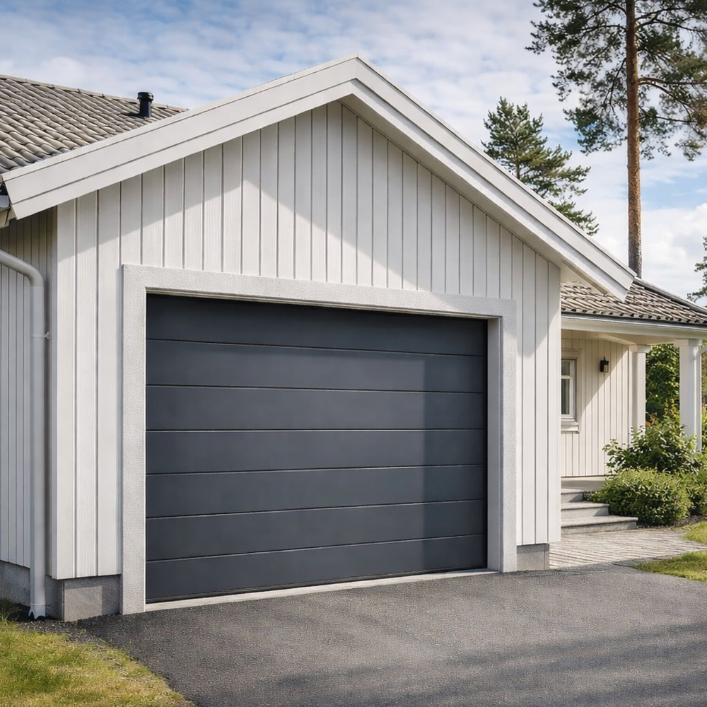 Stabil garageport med en trästruktur på ytan som gör att den inte är helt slät vilket ger den det där lilla extra.