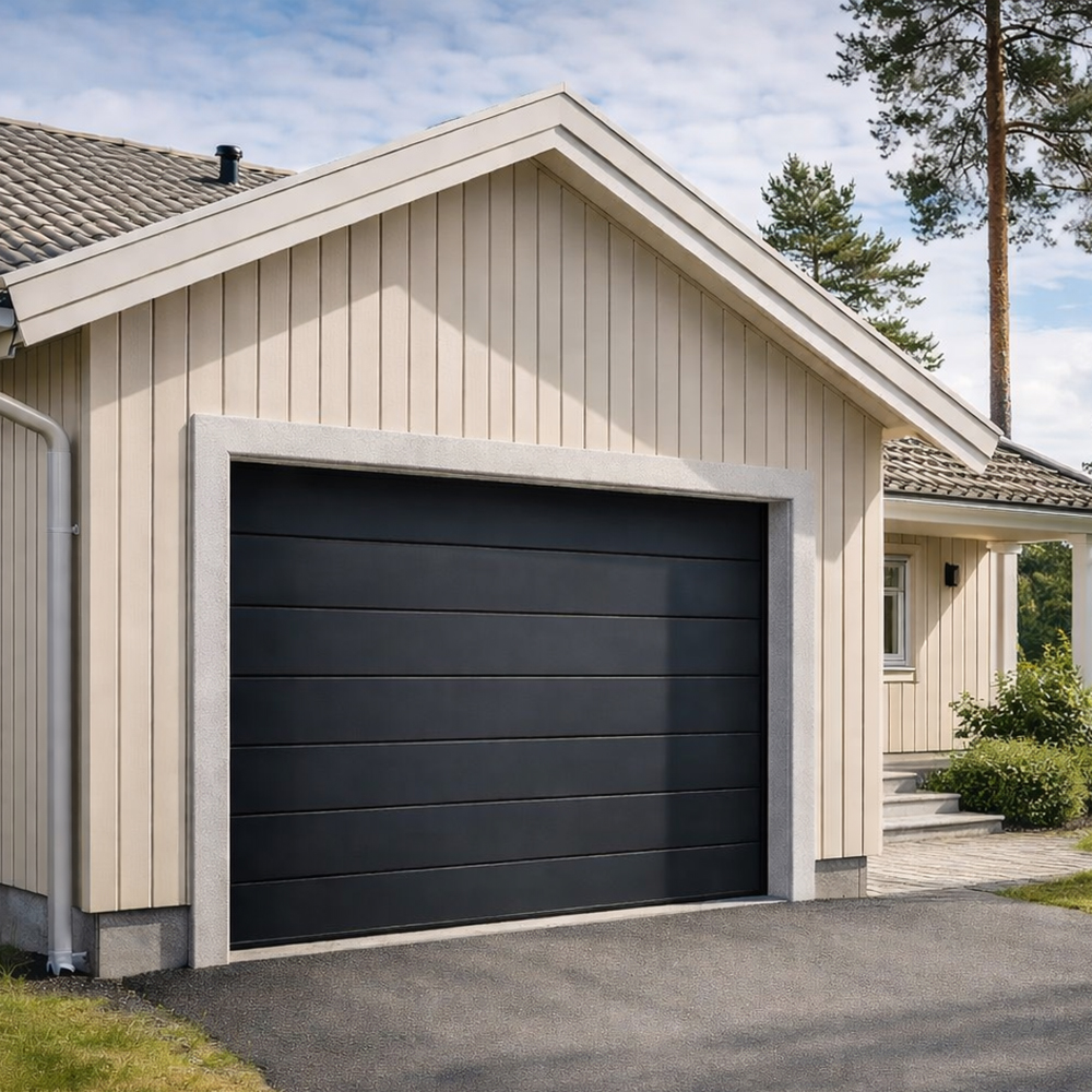 Stabil garageport med en trästruktur på ytan som gör att den inte är helt slät vilket ger den det där lilla extra.