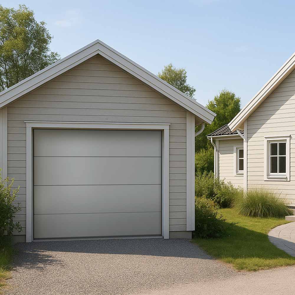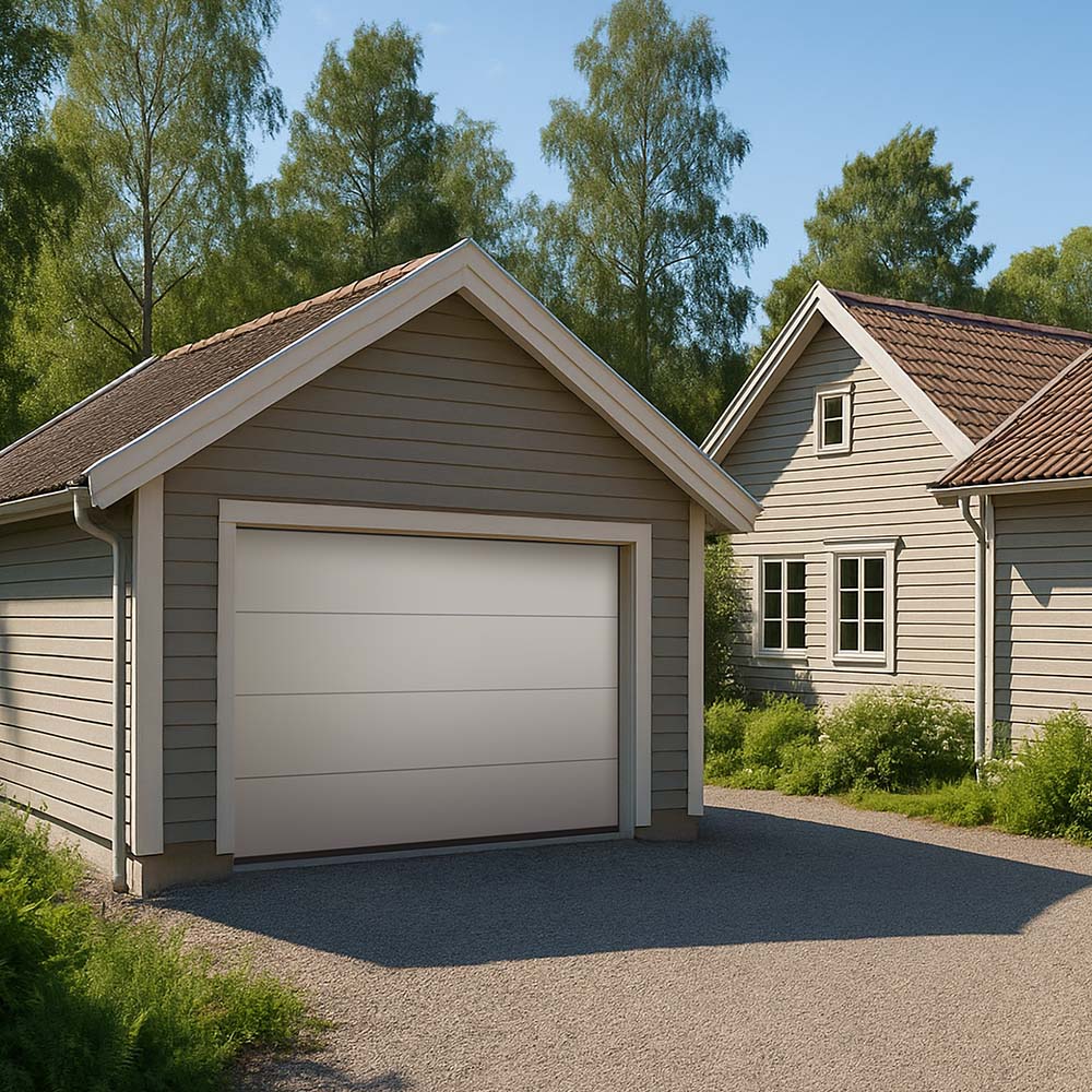 Stabil garageport med en trästruktur på ytan som gör att den inte är helt slät vilket ger den det där lilla extra.