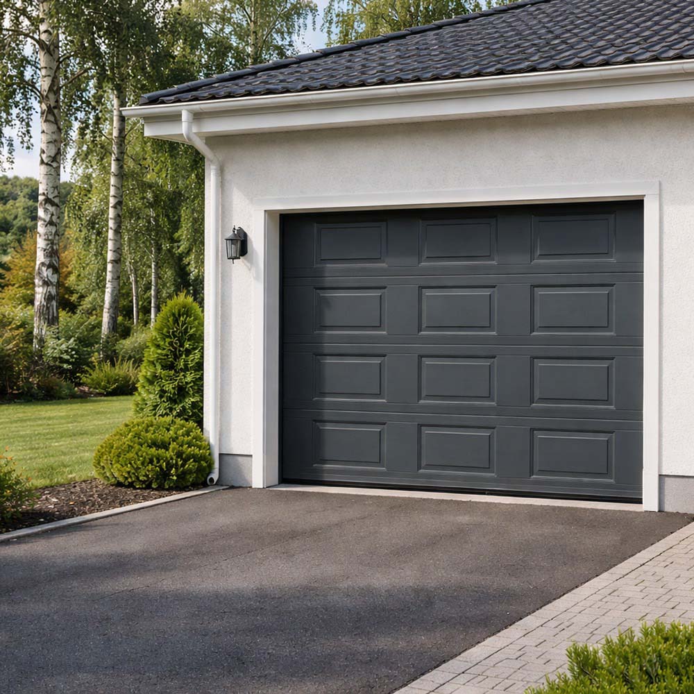 Stabil garageport med en trästruktur på ytan som gör att den inte är helt slät vilket ger den det där lilla extra.