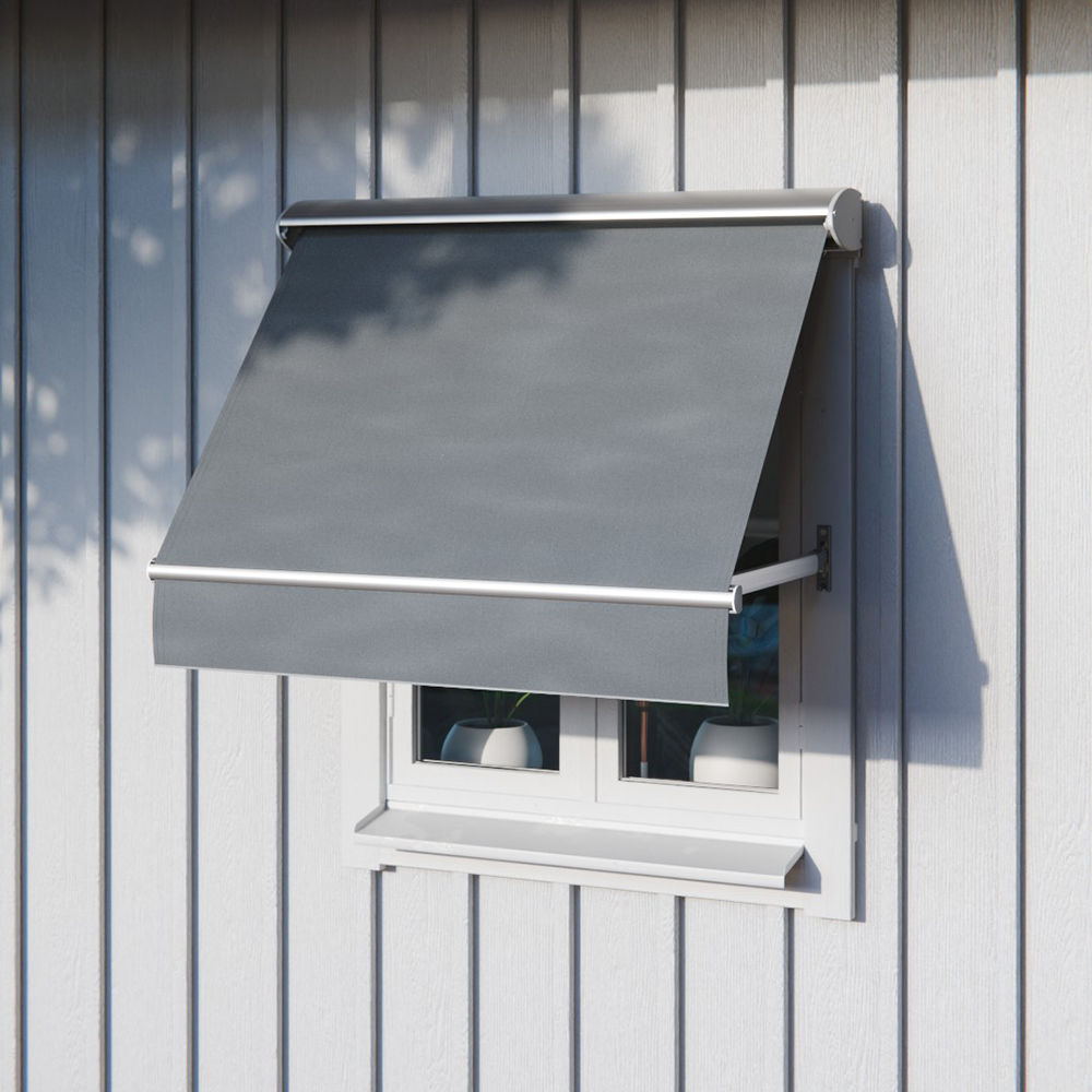Fönstermarkis Granat 301 har ett tyg av vävd kvalitet med något grövre trådsktuktur. Fönstermarkisens ljusgråa tyg passar till de flesta fasader.