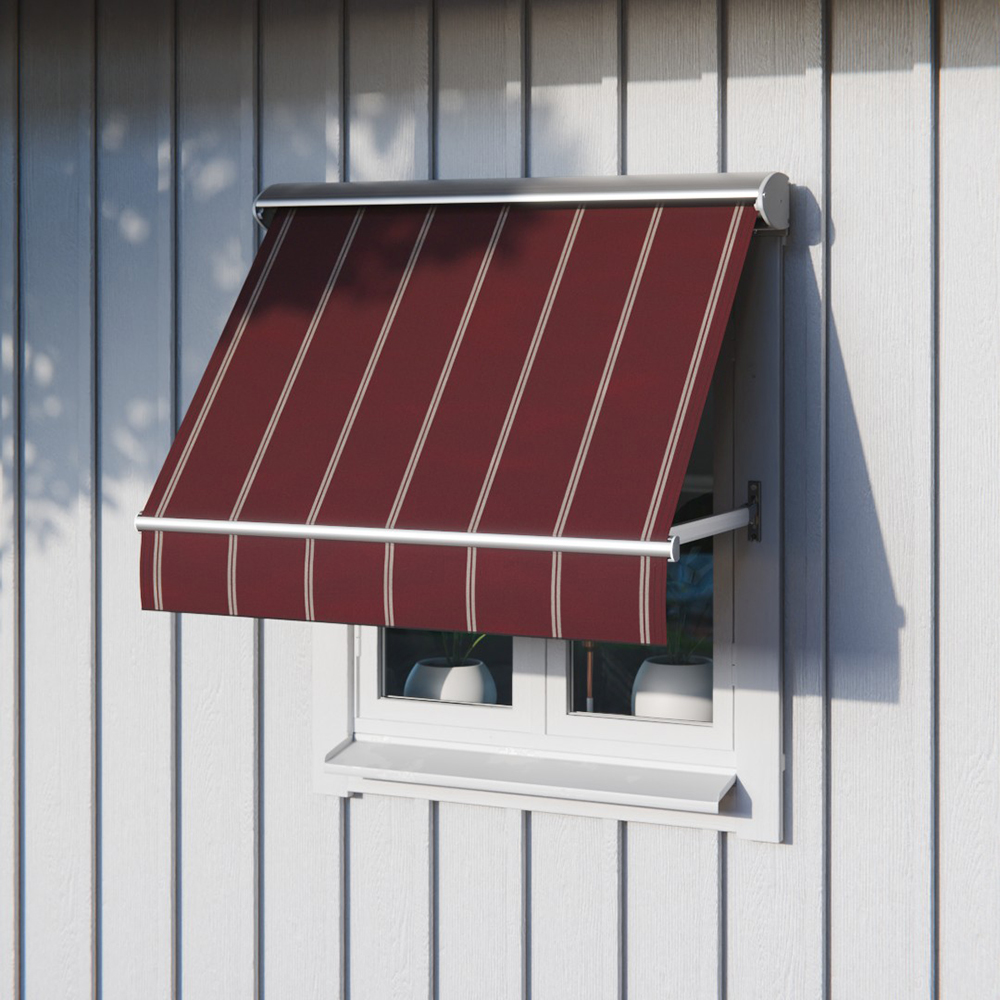 Fönstermarkisen Rubin 401 har ett härligt djuprött tyg med ett mönster av tunna streck. Sätt extra färg på ditt hus med röda markiser.