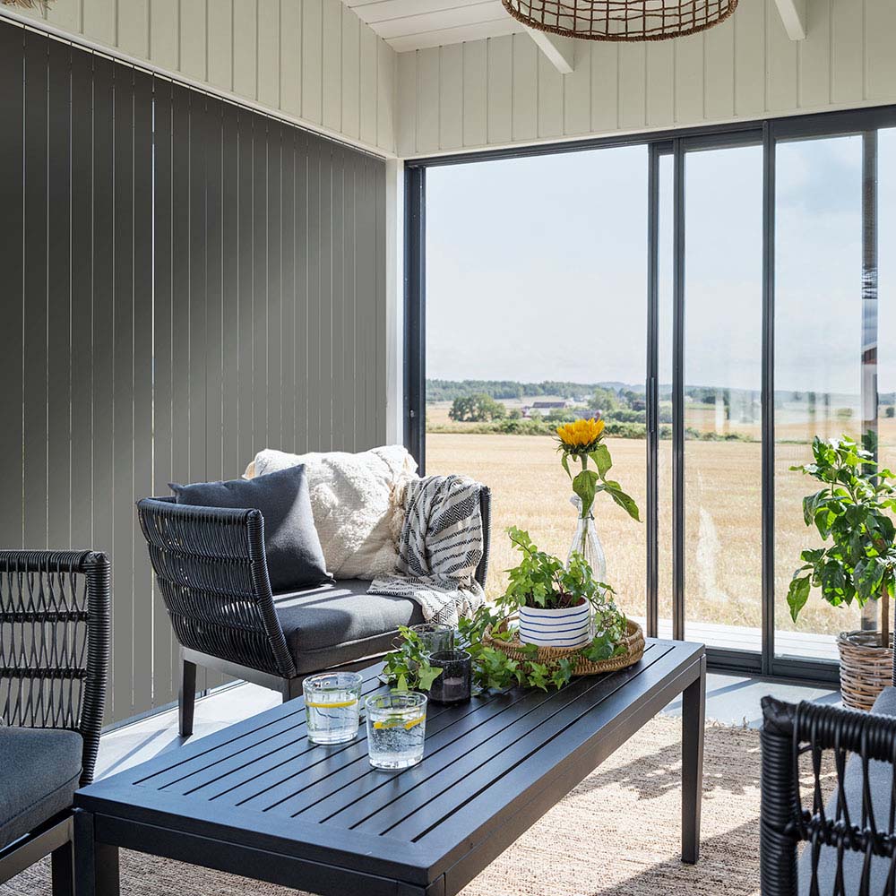 En riktigt tilltalande lamellgardin i en grafitgrå nyans. Gardinen lämnar de starkaste strålarna ute och skapar en behaglig miljö i hem och uterum. LUX Grafit är perfekt för det nybyggda uterummet och blir med sin mörka ton en modern och snygg inredningsdetalj.