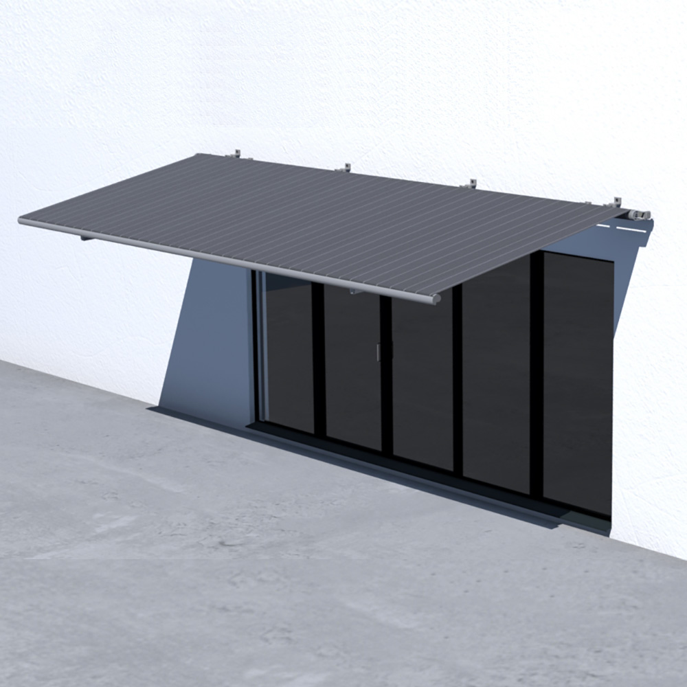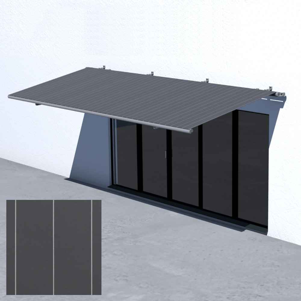 Bredd: Markistygets bredd är 120 cm. Vid beställning av bredare markiser uppstår en skarv i tyget. Sömmen syns mest när tyget är enfärgat eller ljust. Utfallsvinkeln kan ställas från cirka 10 grader upp till cirka 90 grader nedåt.