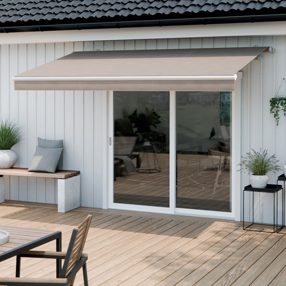 Terrassmarkis med en melerad beige väv. En fräsch och modern nyans som passar de flesta typer av hus.