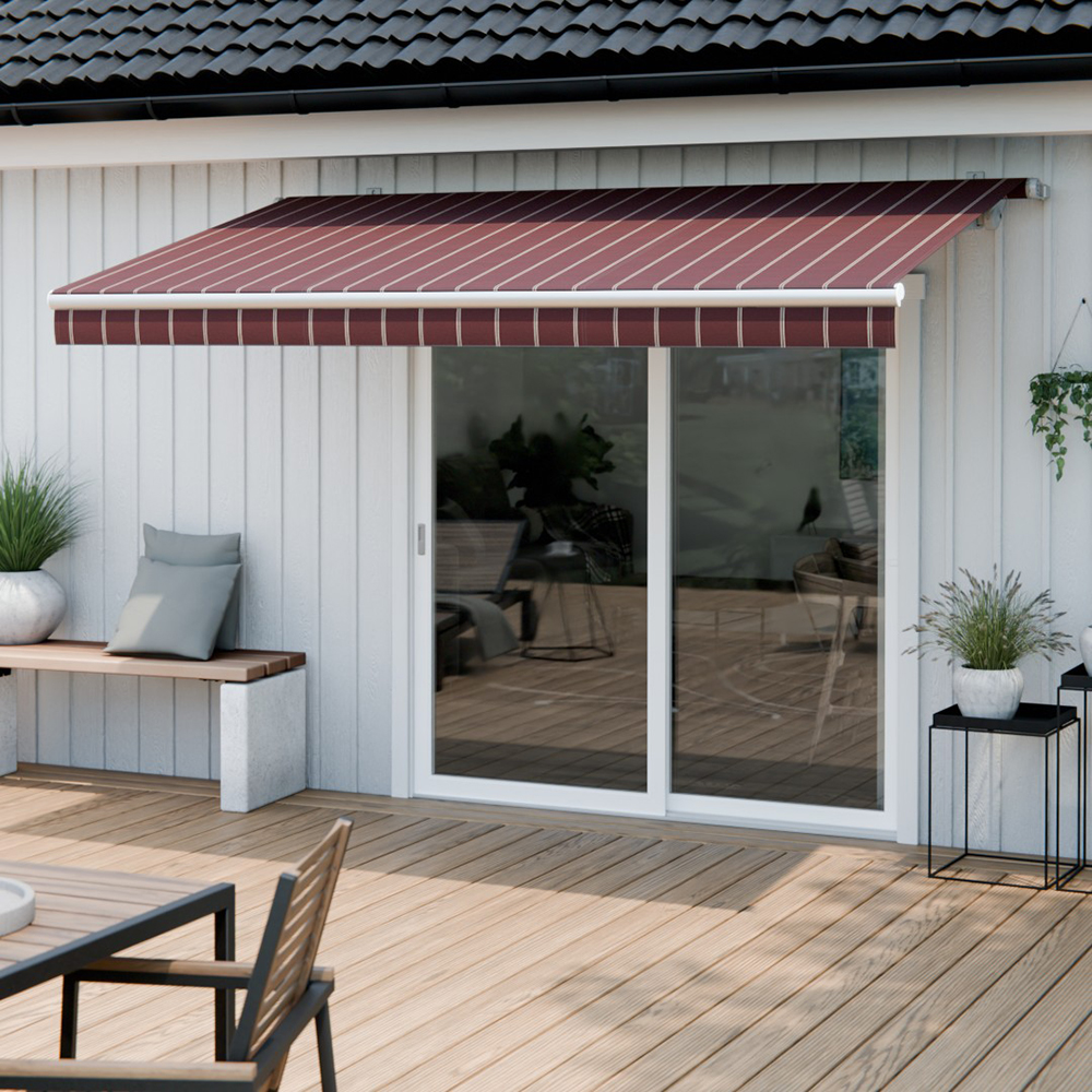 Terrassmarkisen Rubin 401 har ett härligt djuprött tyg med ett mönster av tunna streck. Sätt extra färg på din uteplats med en röd terrassmarkis.