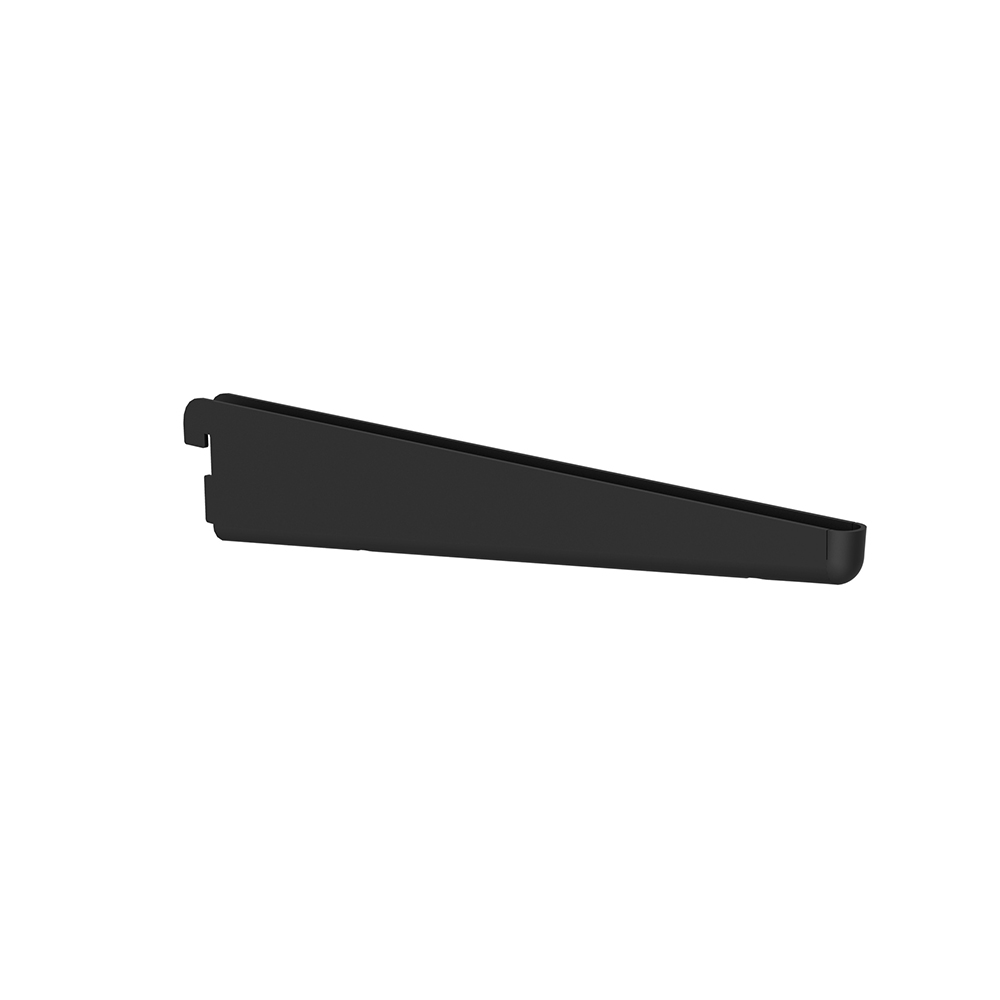 Lundbergs väggkonsoler från Wide-serien hakas fast i en väggskena eller i ett väggfäste och används för att montera en hylla. Ytan är behandlad i mattsvart färg.