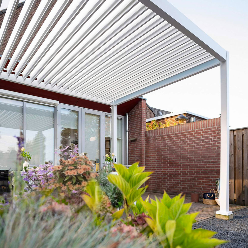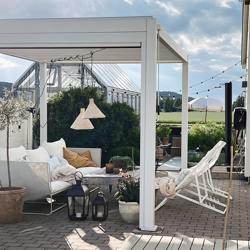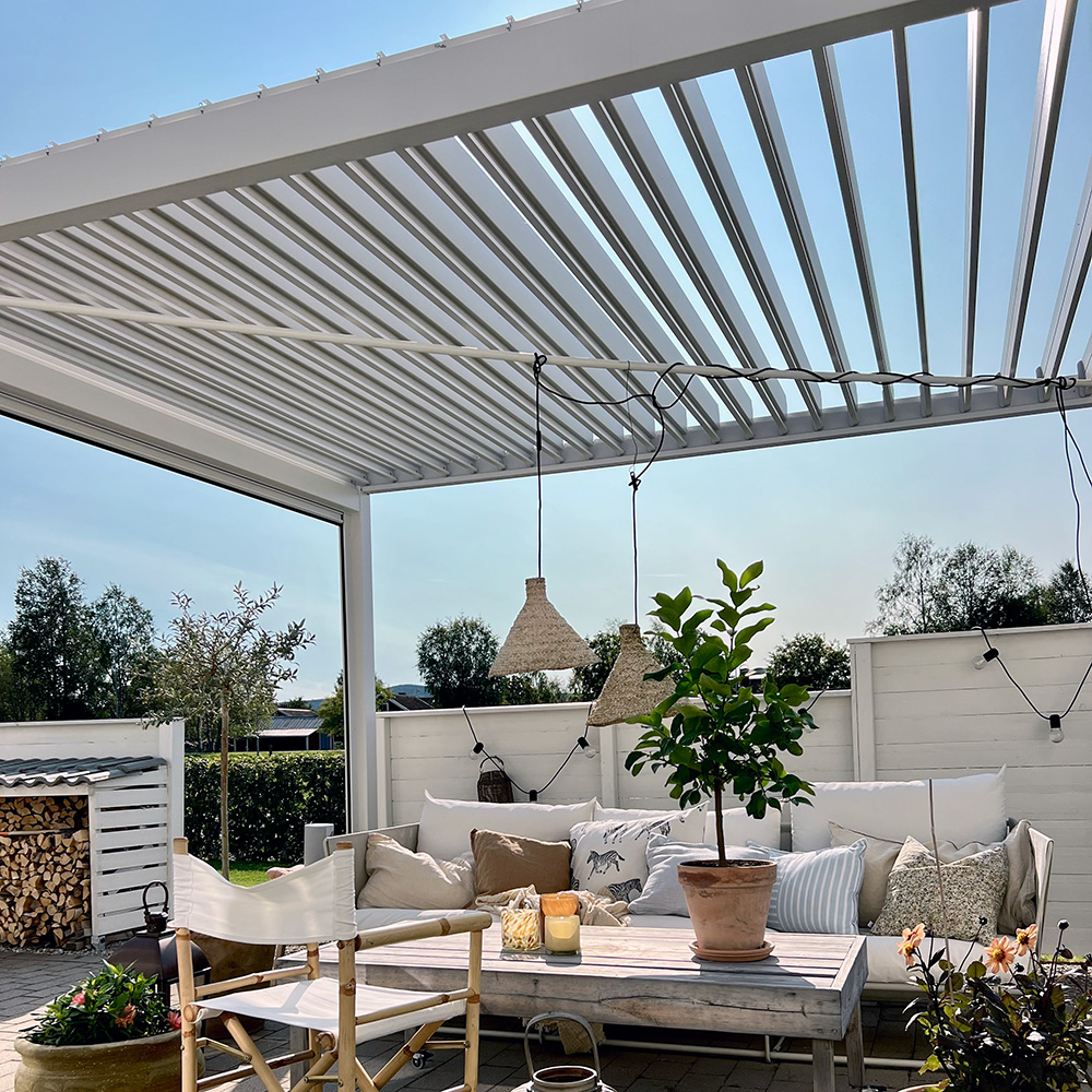 Denna unika pergola har ett fällbart lamelltak som kan skapa skön skugga eller lämnas öppet för att släppa in solen. Du har inte bara möjligheten att välja sol eller skugga utan med taket stängt får du även en skyddad plats när det börjar regna. Aluminium ger dig en enkel och underhållsfri vardag med tid för njutning.