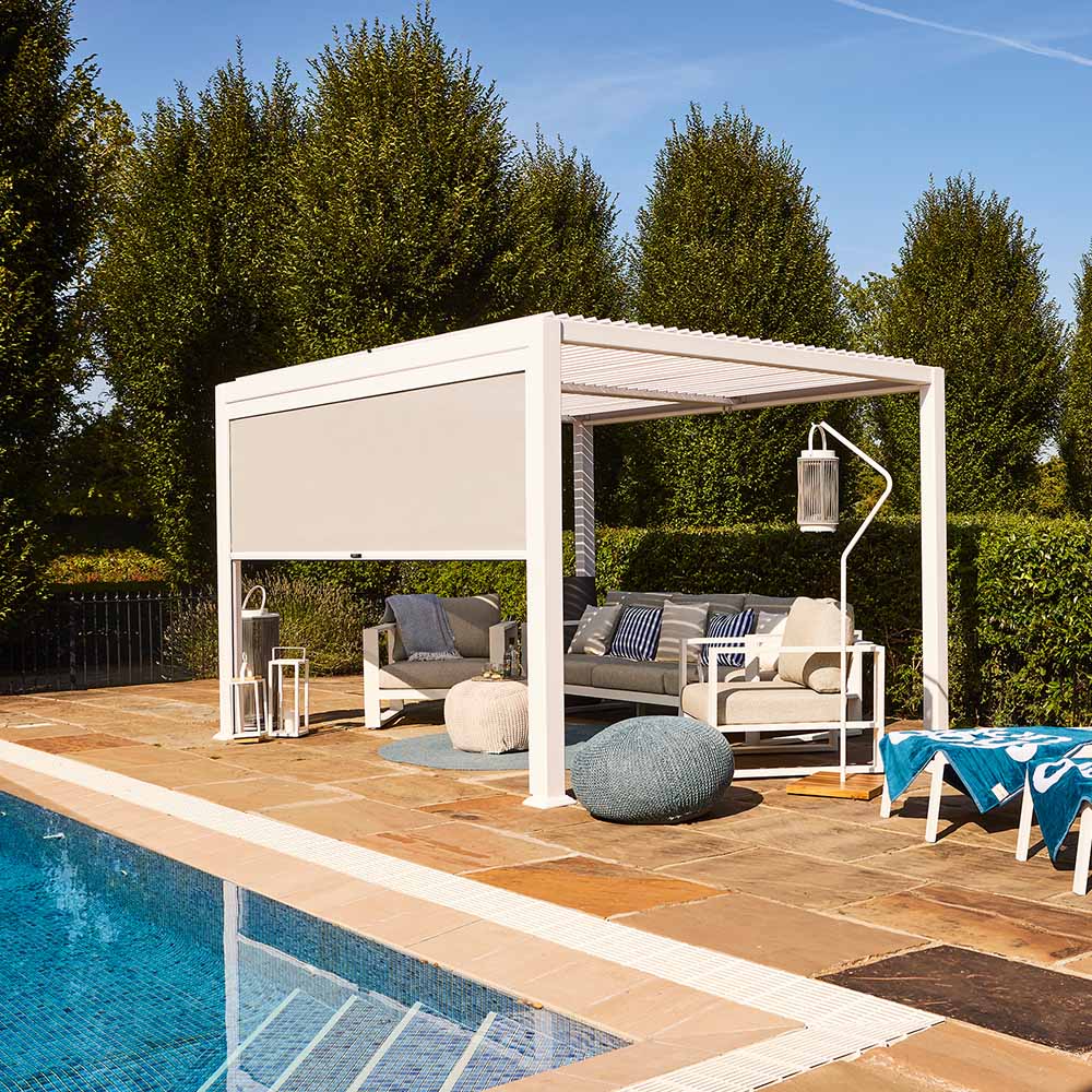Som tillval finns rullbara, vertikala gardiner som ger avskildhet och skugga samtidigt som de även ger skydd mot väder och vind. Det finns även snygga skärmväggar att välja till, allt efter tycke och smak. Dessa två tillval ger känslan av ett uterum och möjligheten till att förlänga kvällarna och säsongen i din pergola.