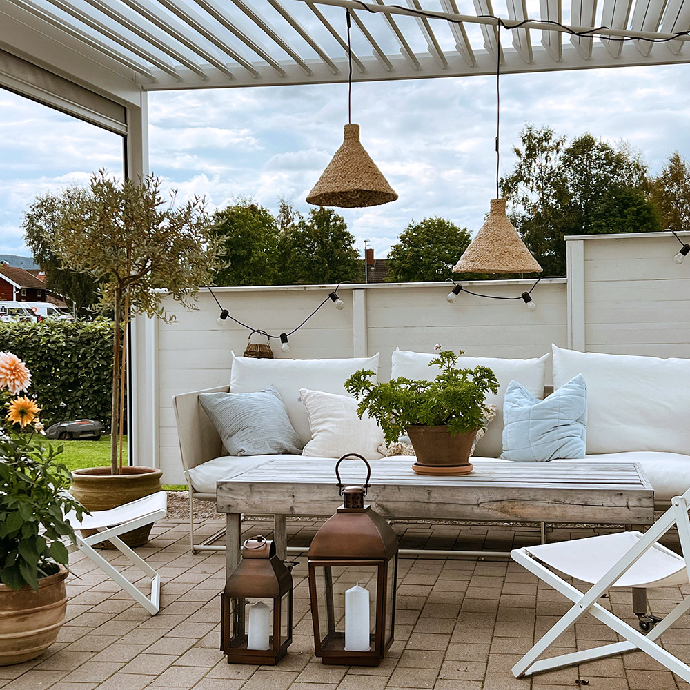 Här får du ett härligt extra rum i hemmet för umgänge med familj och vänner. En idealisk lösning för dig som önskar en plats för avkoppling i solstolen och loungemöblerna eller härliga middagar runt långbordet till sent in på kvällen.