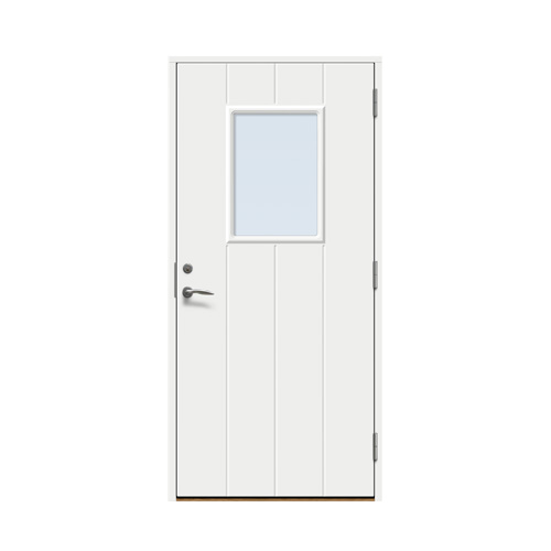 Regnvatten och kondens rinner längs dörrens framsida och tröskeln blir blöt. Dörren är fin, men borde inte användas utomhus. |