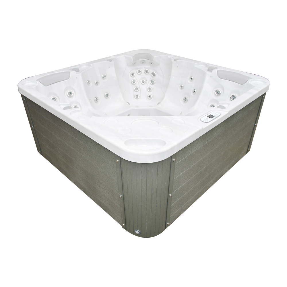 Spabadet är gjort i grå ytterpanel av väderbeständigt, träliknande, kompositmaterial. Lock ingår. Inkoppling: 230V 3x16A.