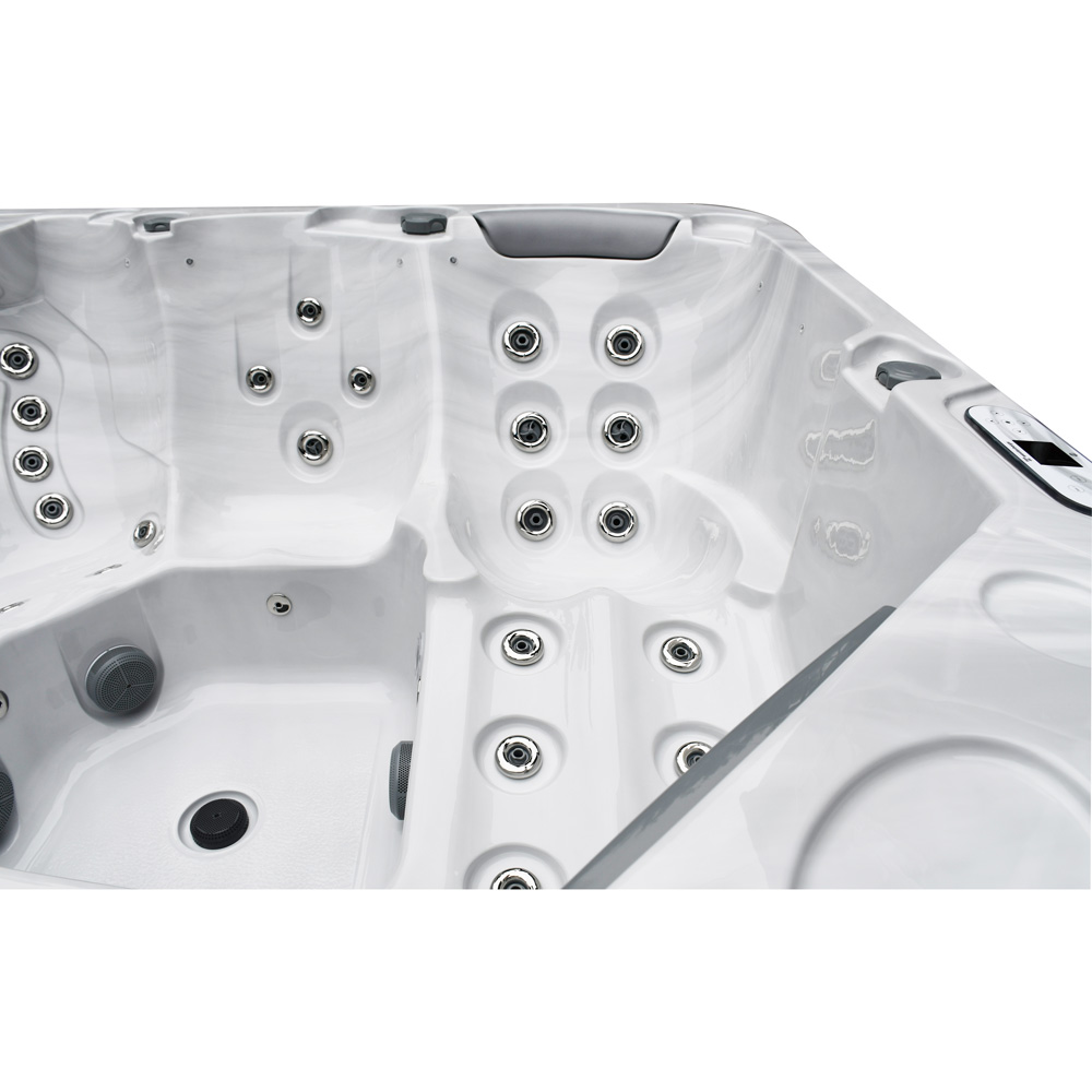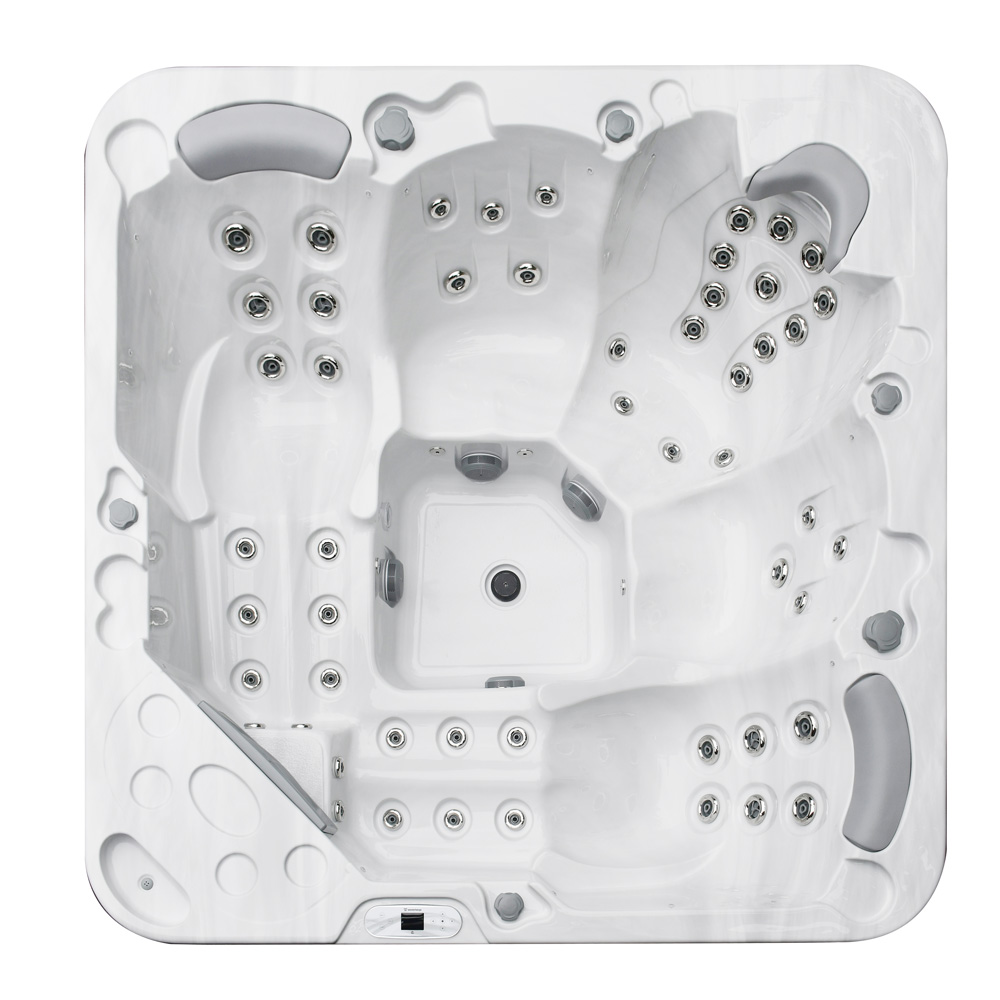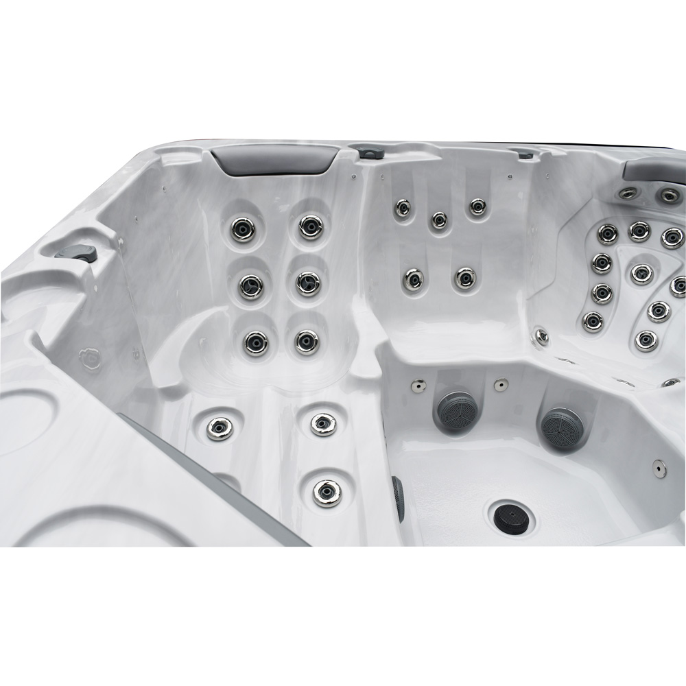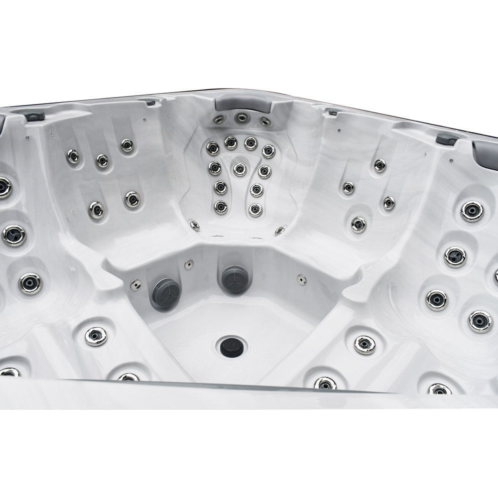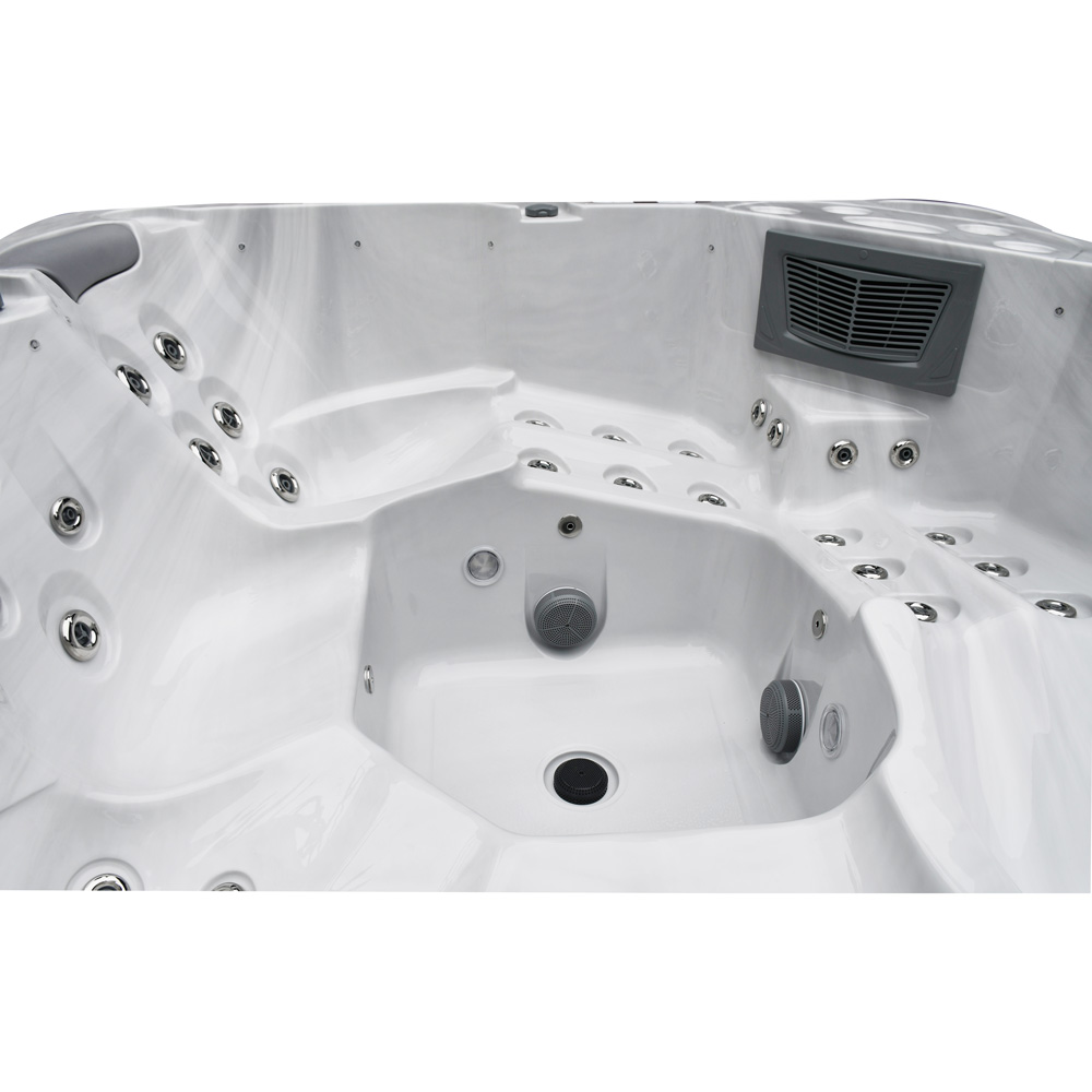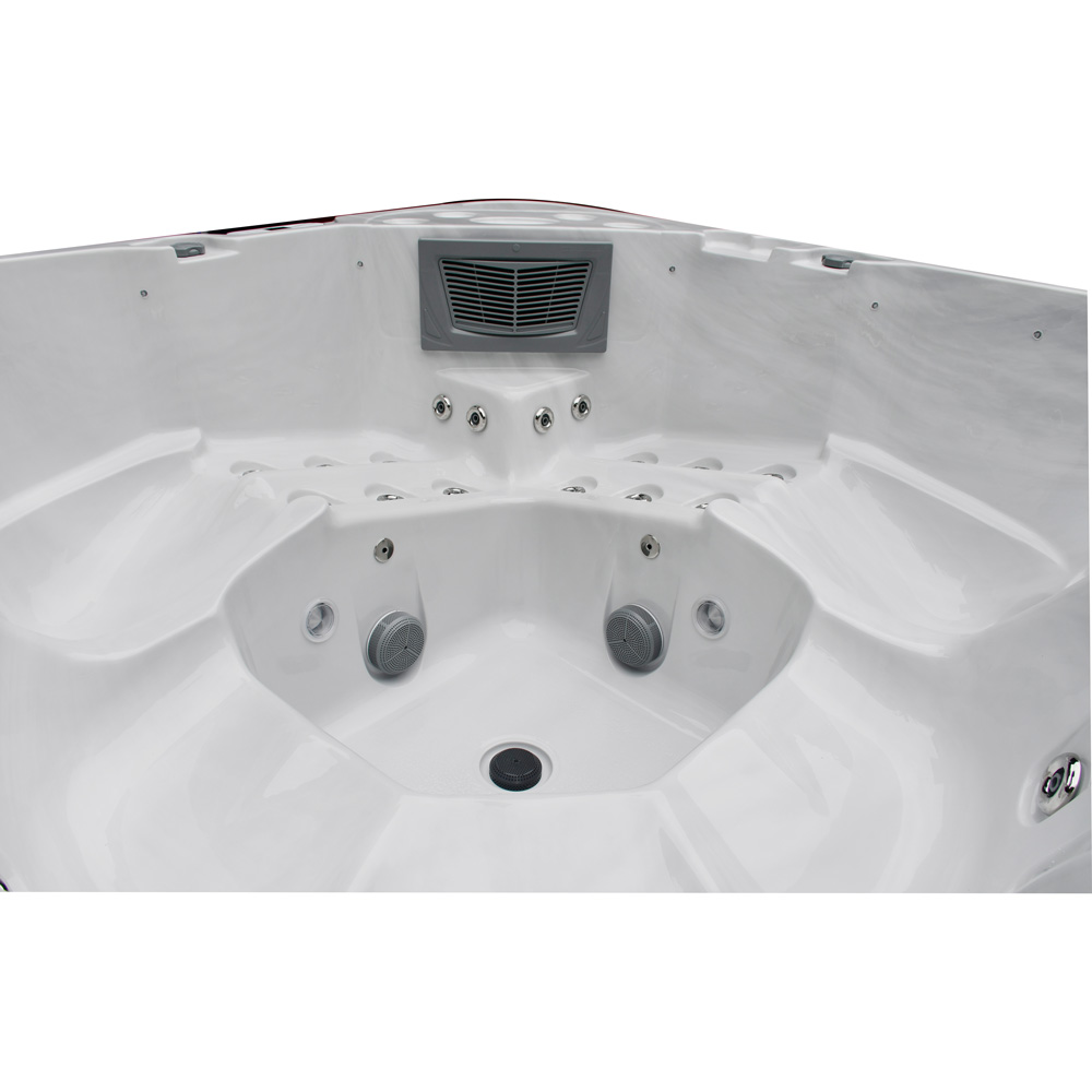 Ett mycket generöst kar som ger hög komfort och skön massage. Karet rymmer fem personer och har tre mjuka nackstöd för bästa komfort. Med två lounger kan två personer koppla av samtidigt och med 60 riktbara och avstängningsbara jets får du får massagen där du önskar. Trippelisolerat och med stämningsfull terapibelysning i botten och vattenlinjen.