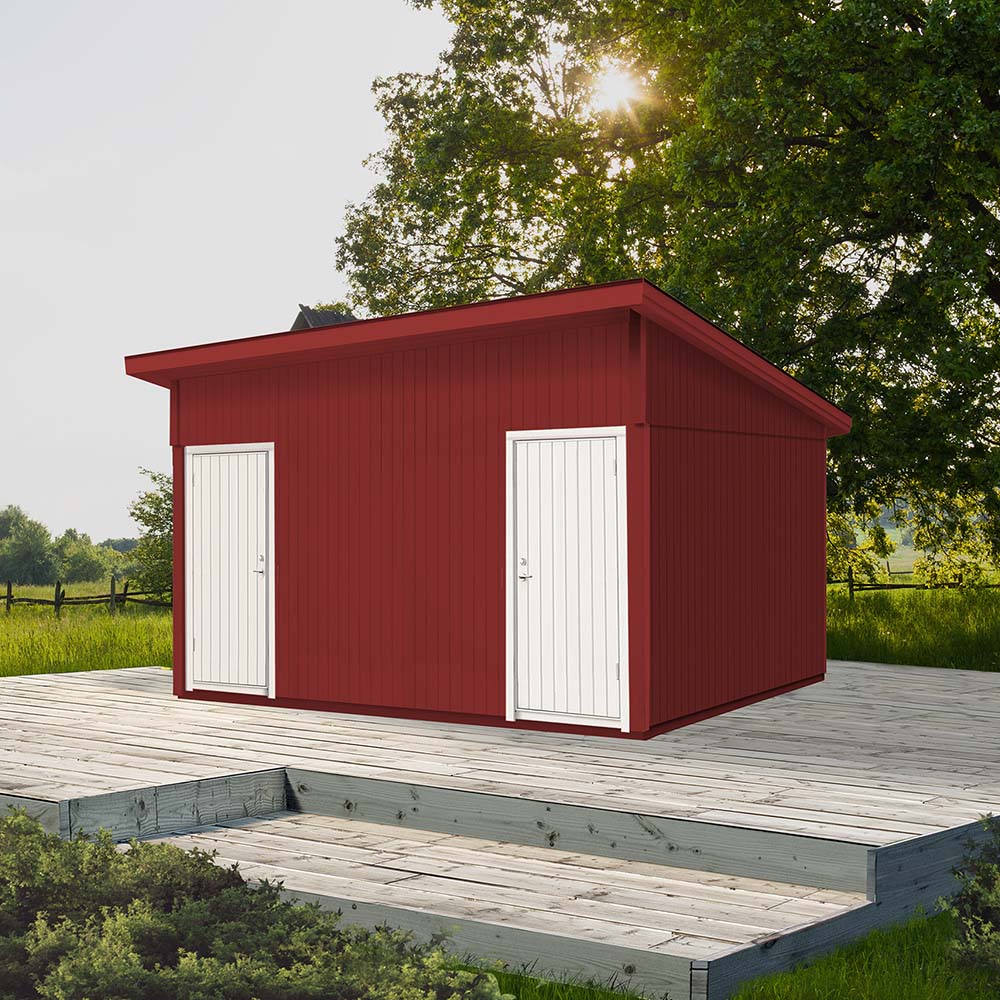 Erikstorp från Vibostugan är ett rejält förråd i funkisstil med plats för både gräsklippare och trädgårdsmöbler. Två ingångar ger dig möjlighet att dela upp och göra två förråd utifrån ditt behov.