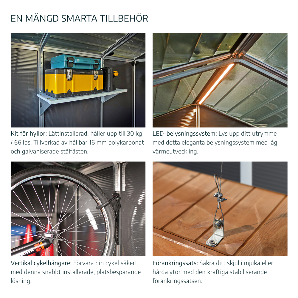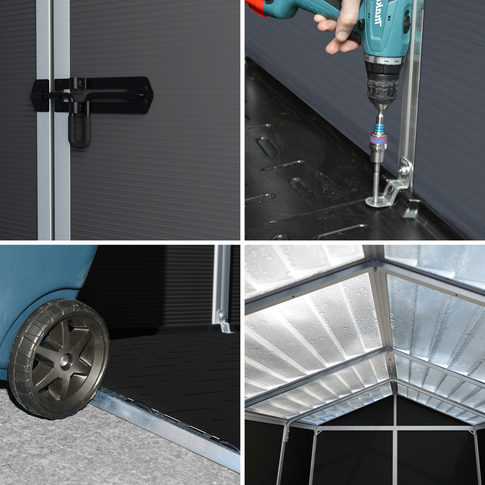 Med dubbeldörrar, låg tröskel och en halksäker golvplatta får du enkel tillgång och trygg förvaring av allt från trädgårdsredskap till sportutrustning. Rubicon är designat för snabb och enkel montering med ett smart “Easy-Slide”-system. Det är dessutom förberett för att förankras på fasta ytor såsom trä, betong eller metall för extra stabilitet.