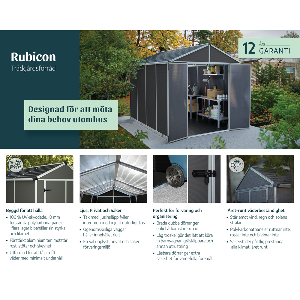 Rubicon är det perfekta förrådet för dig som vill ha en slitstark, underhållsfri och miljövänlig förvaringslösning. Med sina generösa mått på 229 x 237 cm och tillverkad av 100 % återvunna material, kombinerar detta plastförråd från Palram – Canopia styrka, hållbarhet och smart funktionalitet.