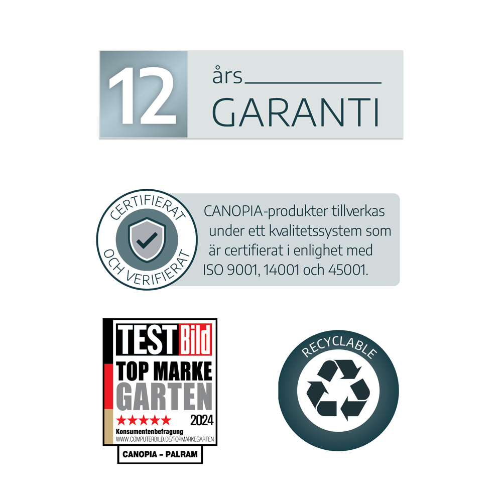 | Material vägg/tak | 10 mm polykarbonat (UV-skyddat) |