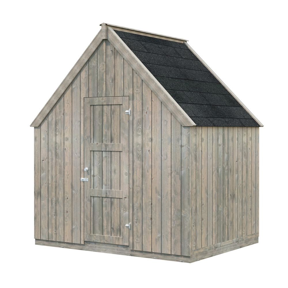 Förrådet levereras som en byggsats med en utförlig byggbeskrivning. Takbeklädnaden som ingår är shingel.