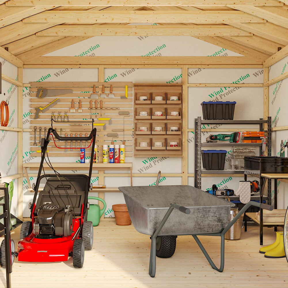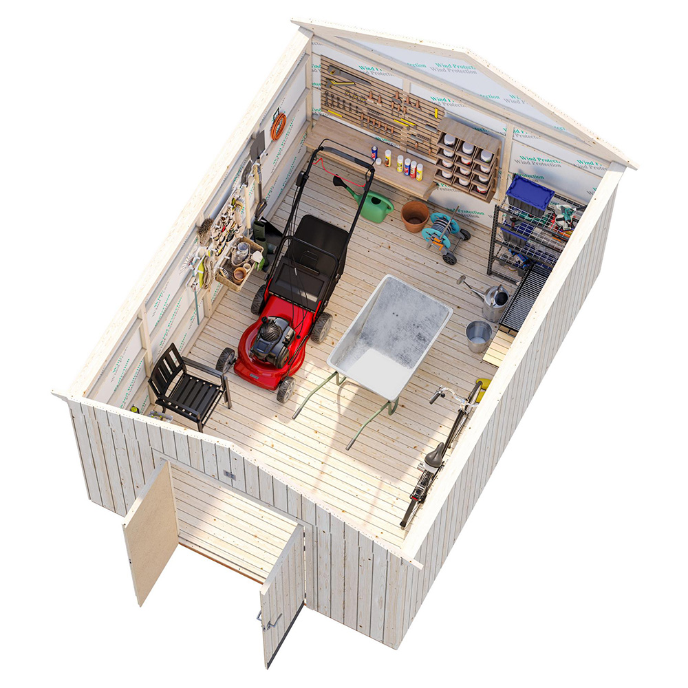 Modernt förråd med färdiga väggelement som invändigt är klädda med vindskyddsfolie, vilket gör det väldigt väderbeständigt. Modellen innehåller ett komplett set av dörr- och väggelement. Enkel konstruktion möjliggör snabb och enkel montering.