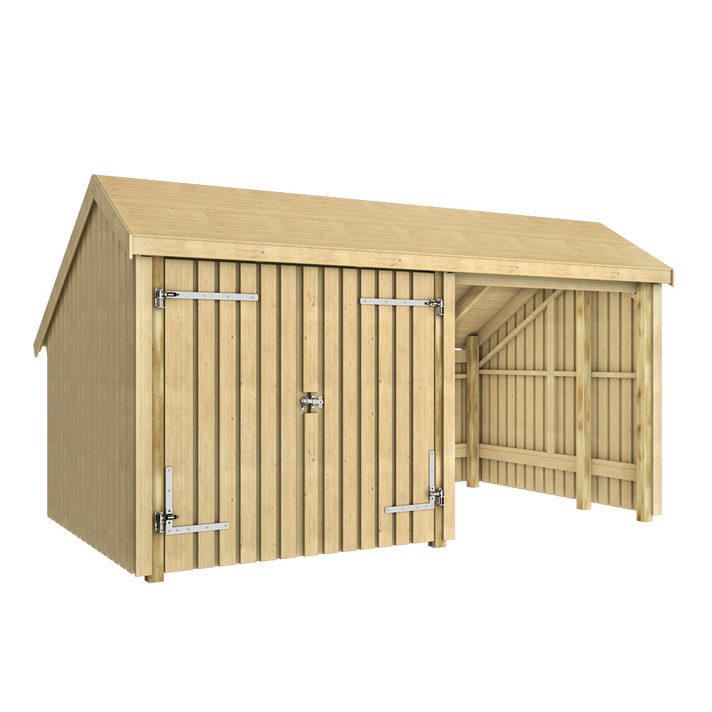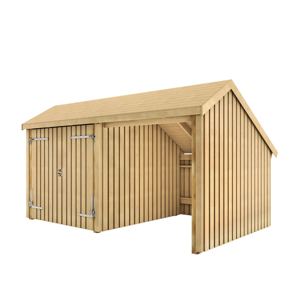 Multi trädgårdshus 10,5 m² kombinerar praktisk förvaring med ett öppet, skyddat trädgårdsrum. Den smarta konstruktionen med både dubbeldörr och öppen front gör det enkelt att skapa två zoner – en för förvaring och en för umgänge, hobby eller vedförvaring.