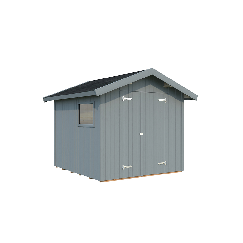 Förrådet levereras som monteringssats och utförliga anvisningar medföljer. Det är tillverkat i nordisk gran med färdiga väggelement.