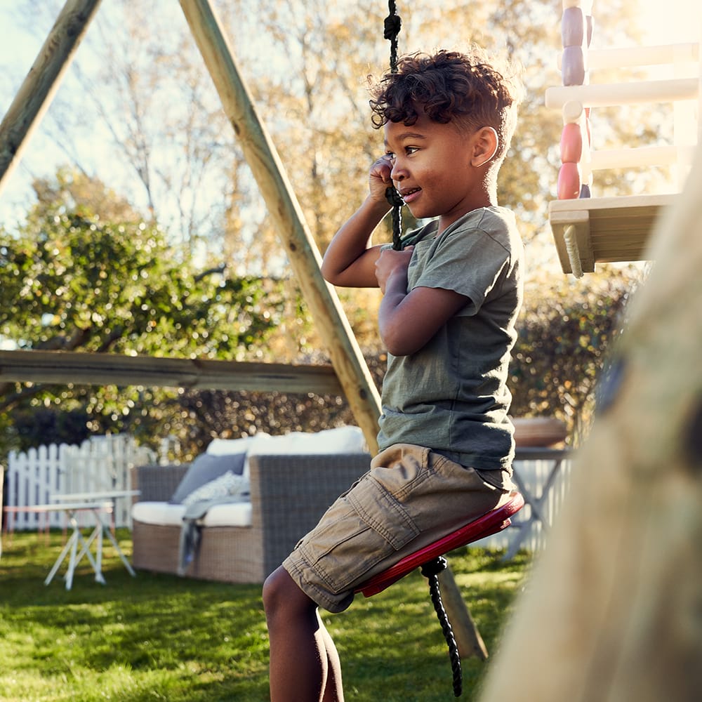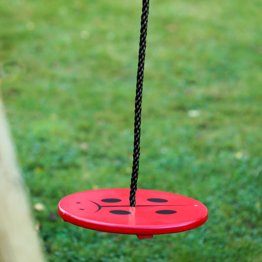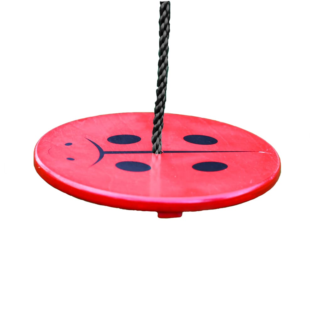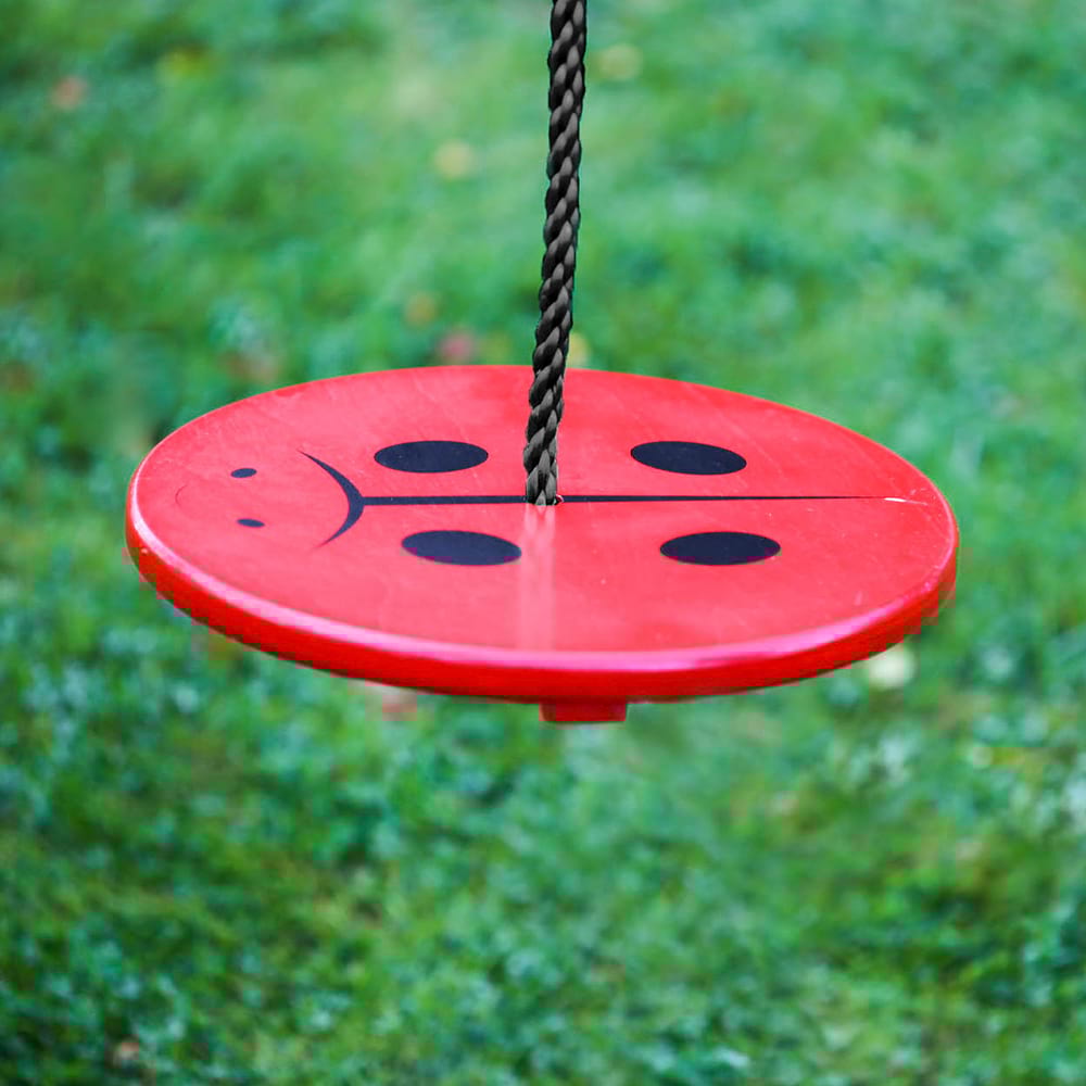 Sittplattan är målad som en nyckelpiga i rött och svart. Gungan kommer i laserad plywood och är FSC®- och CE certifierad.