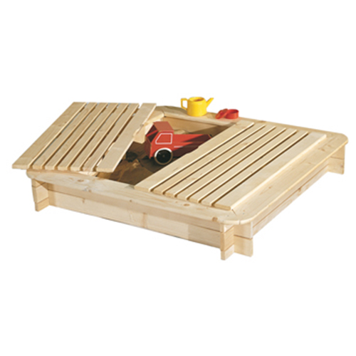 En knuttimrad sandlåda med sittbräda. Praktiskt lock som skyddar sandlådan och sedan enkelt tas bort när det blir dags för lek. Sandlådan ska behandlas med impregnering alternativt grundfärg + täckfärg då den levereras i obehandlat trä.