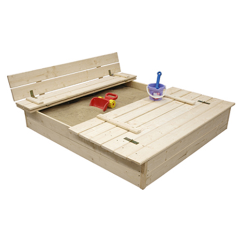 Denna sandlåda har ett lock som blir en smart sittbänk med ryggstöd när det fälls upp. Locket är heltäckande för bästa skydd åt både leksaker och sand. Nu finns den i ett större utförande så plats för flera barn. Sandlådan ska behandlas med impregnering alternativt grundfärg + täckfärg då den levereras i obehandlat trä