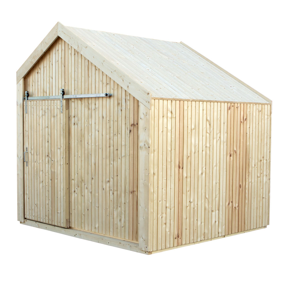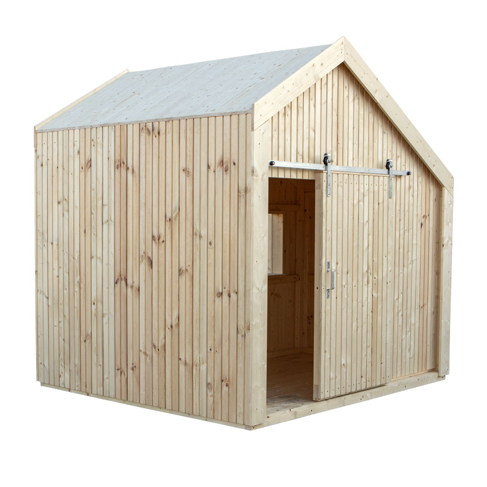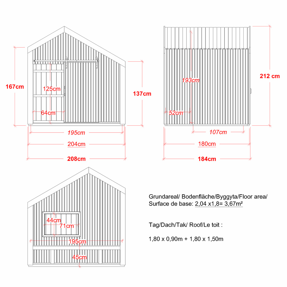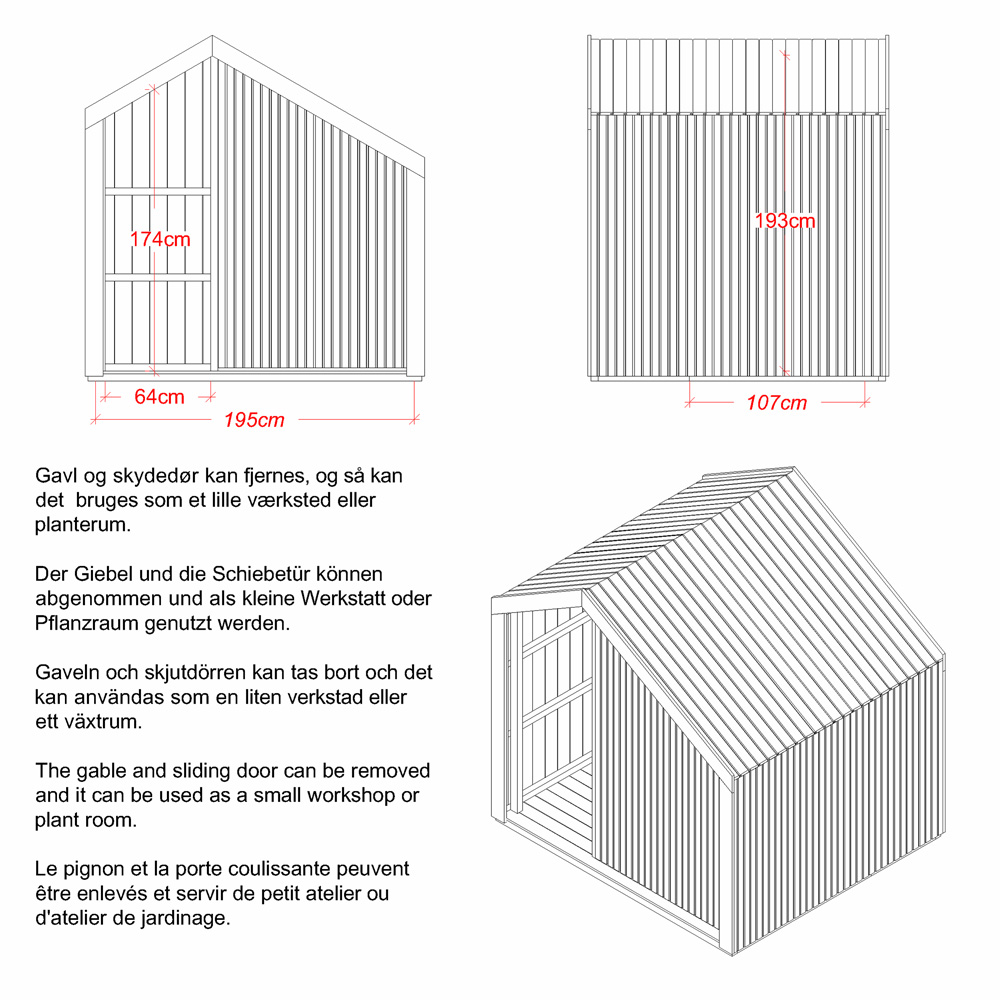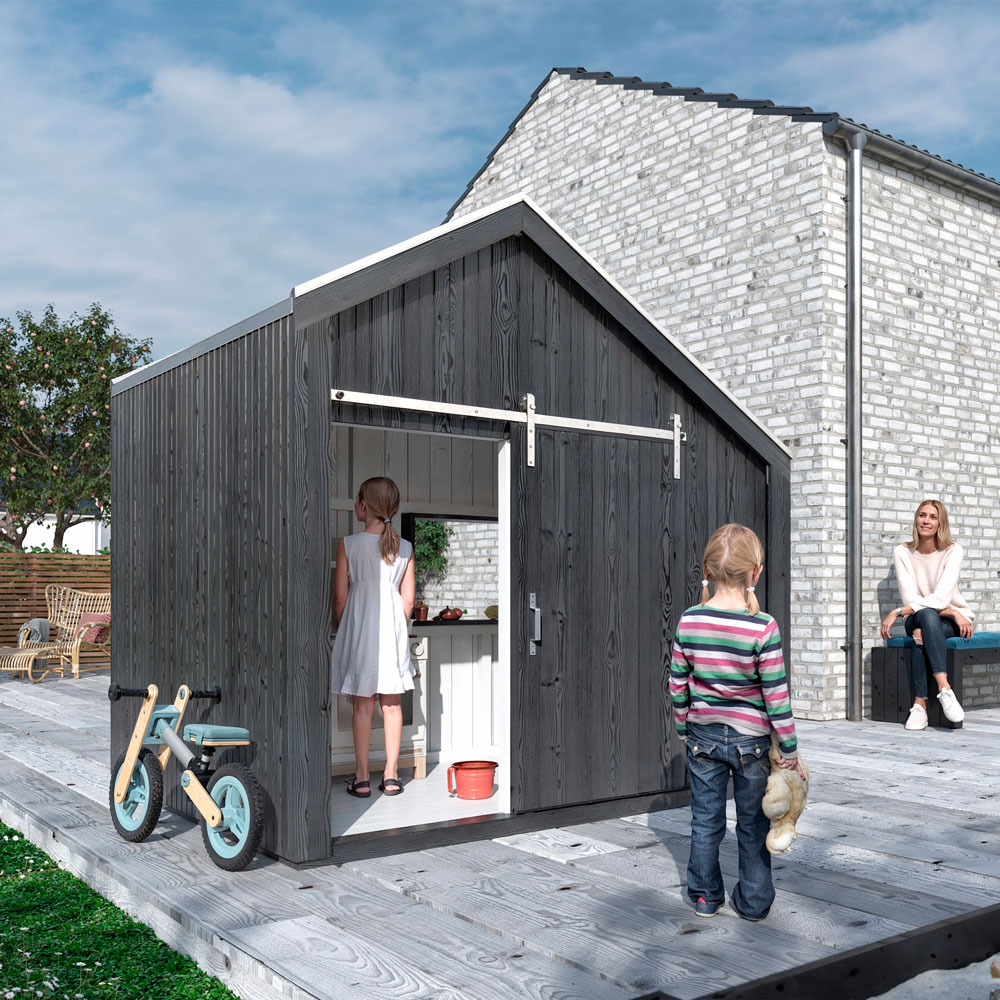 På baksidan finns en praktisk skjutdörr som gör lekstugan lätt att använda och ger flera möjligheter till lek och förvaring. När barnen blir äldre kan huset enkelt få nytt liv – ta bort gaveln eller dörren och använd det som redskapsskjul, planteringsrum eller ett litet uteförråd.